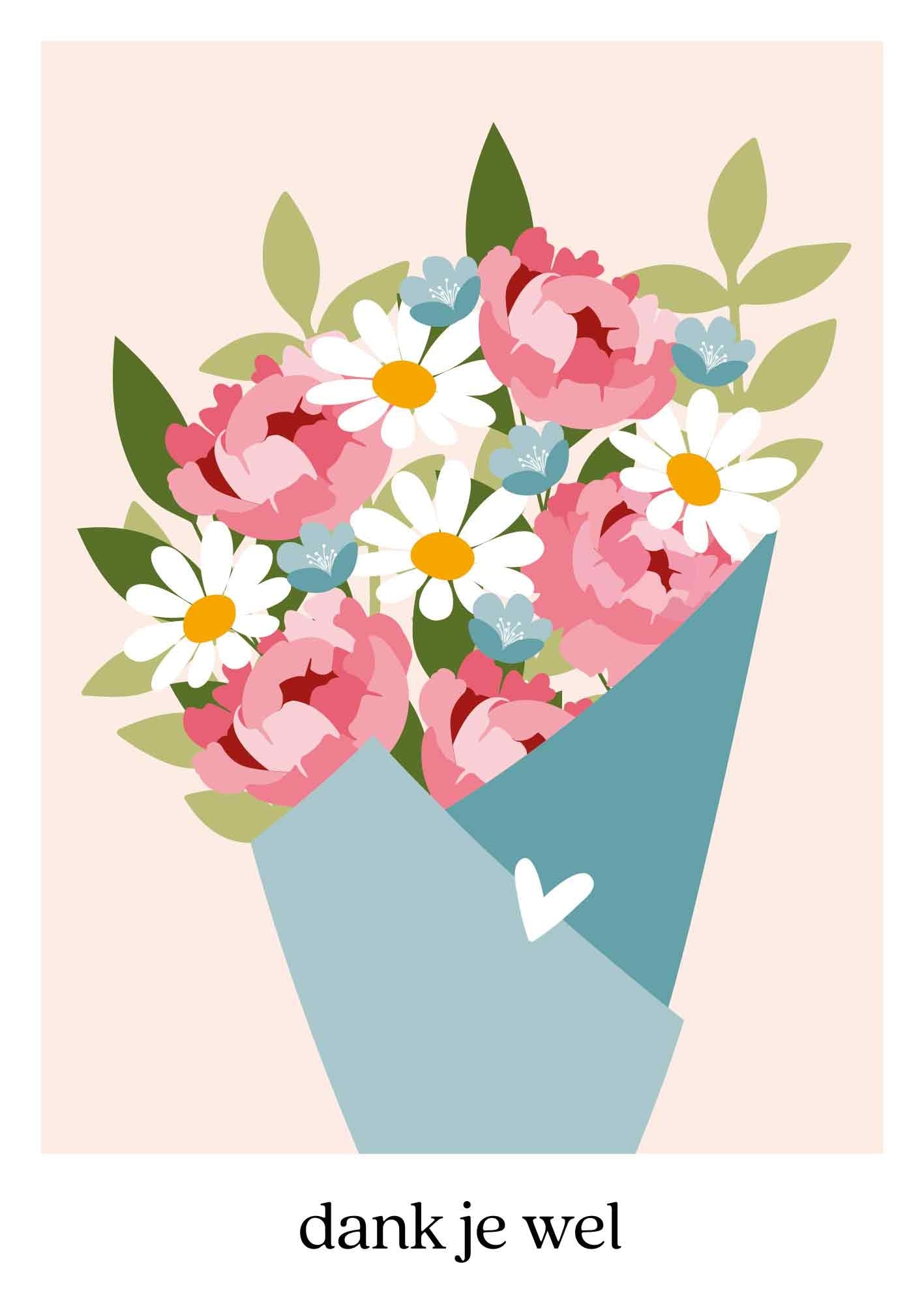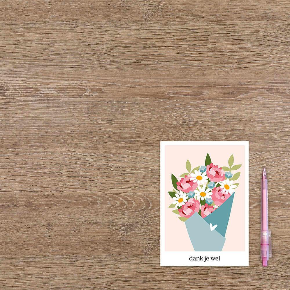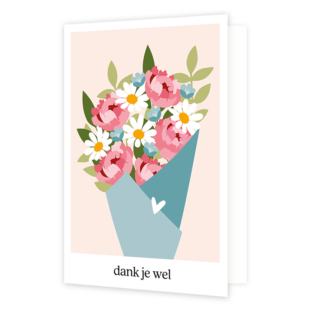 De wenskaart heeft een afmeting van x en een staande vorm. Op deze wenskaart staat een bos bloemen in de kleuren roze, groen, blauw, wit en geel. Onder de illustratie staat de tekst: "Dank je wel". De binnenzijde van de wenskaart is bedrukt met een ontwerp passend bij de voorzijde van de kaart .