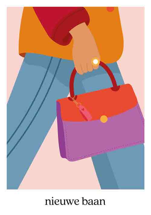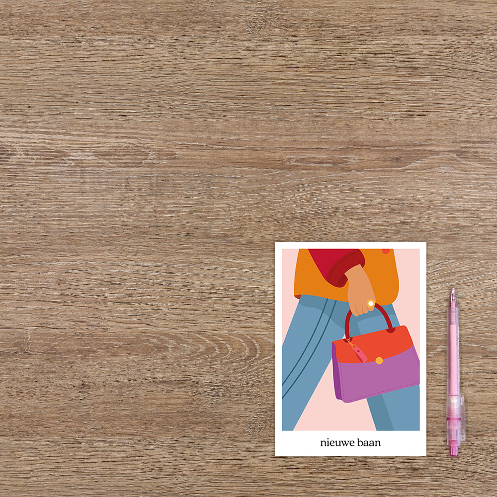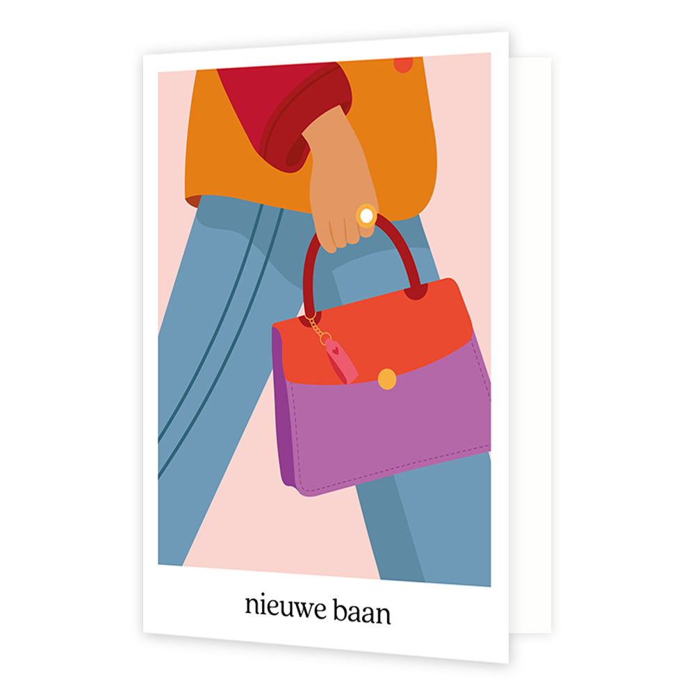 De wenskaart heeft een afmeting van x en een staande vorm. Op deze wenskaart staat een persoon die een rood/paarse handtas vast heeft. Onder de illustratie staat de tekst: "Nieuwe baan". De binnenzijde van de wenskaart is bedrukt met een ontwerp passend bij de voorzijde van de kaart .
