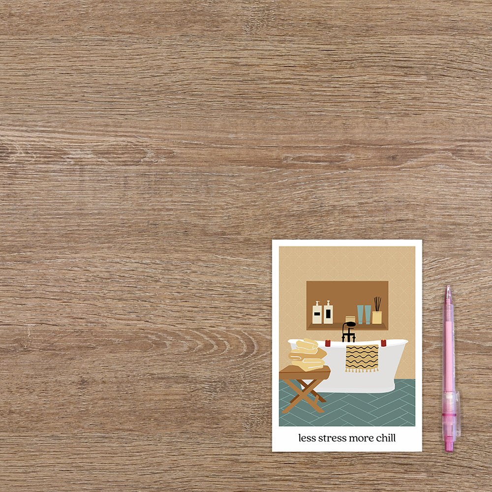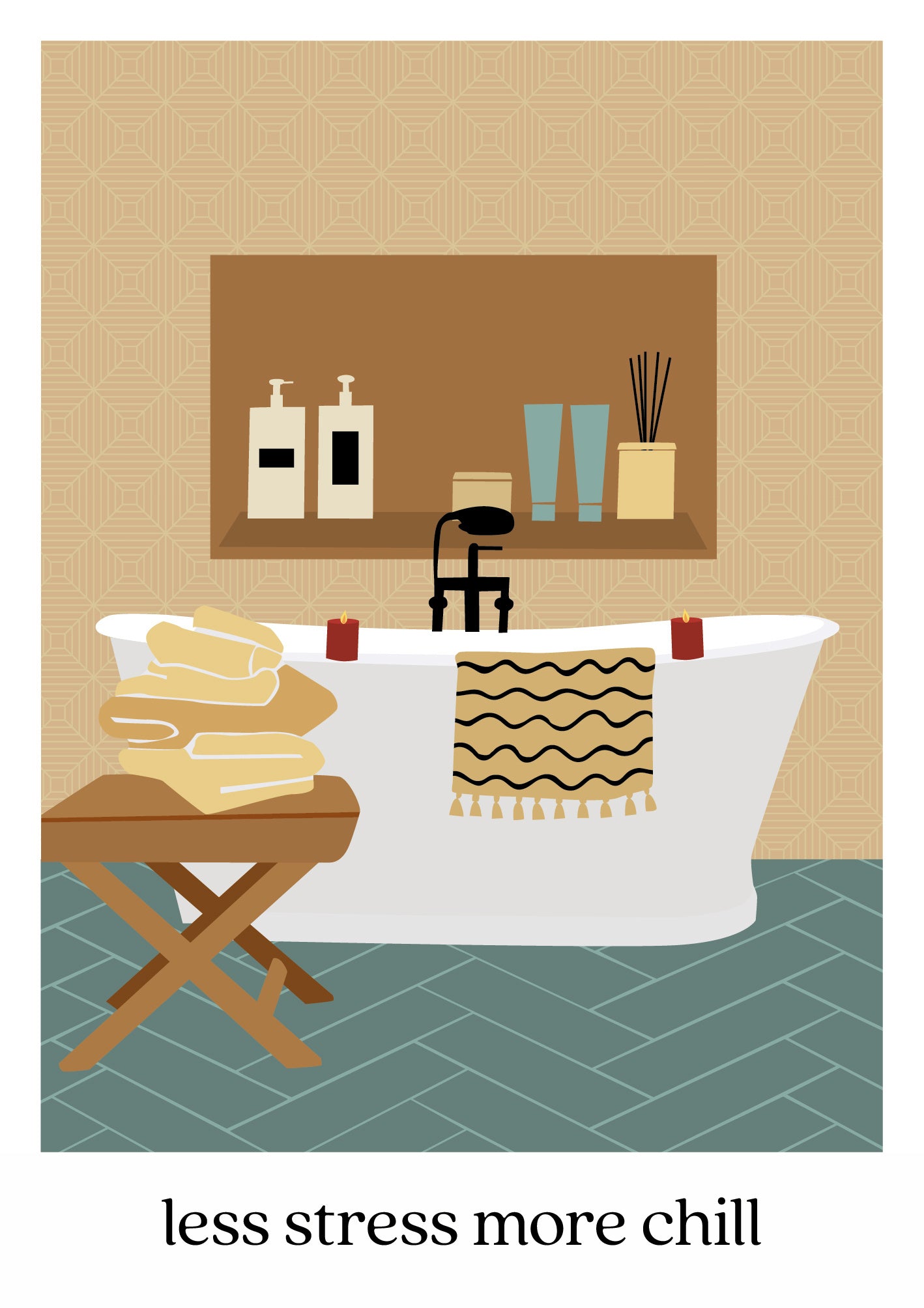 De wenskaart heeft een afmeting van x en een staande vorm. Op deze wenskaart staat een badkamer met een badkuip. Onder de illustratie staat de tekst: "Less stress more chill". De binnenzijde van de wenskaart is bedrukt met een ontwerp passend bij de voorzijde van de kaart .