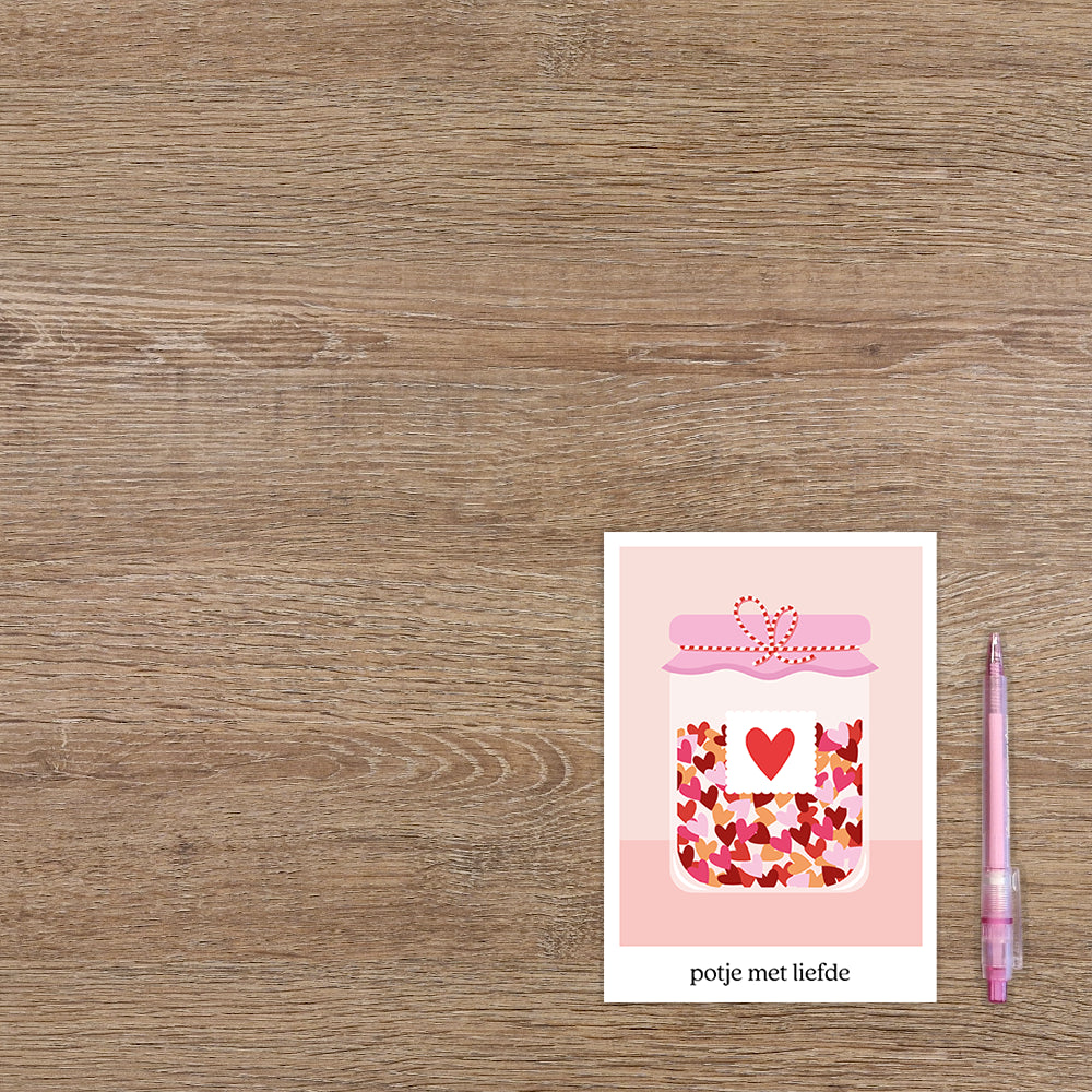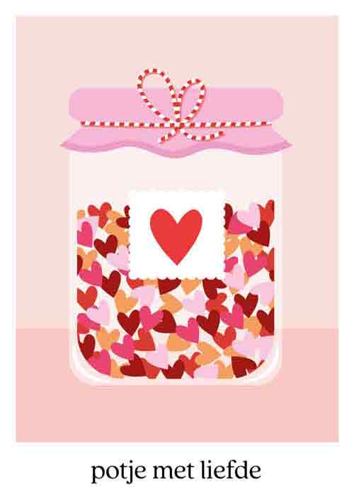 De wenskaart heeft een afmeting van x en een staande vorm. Op deze wenskaart is een pot te zien met hartjes in de kleuren rood, bordeaurood, roze en goud te zien. Onder de illustratie staat de tekst: "Potje met liefde". De binnenzijde van de wenskaart is bedrukt met een ontwerp passend bij de voorzijde van de kaart .
