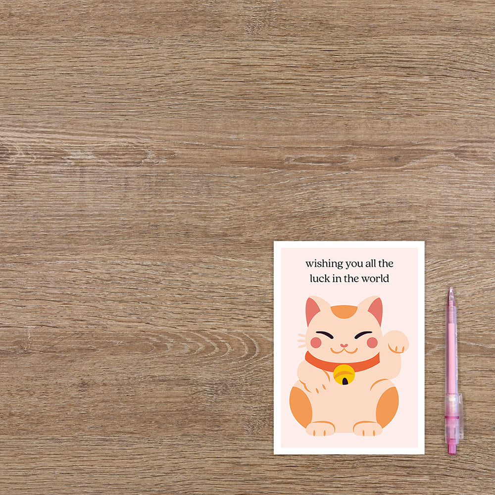 De wenskaart heeft een afmeting van x en een staande vorm. Op deze wenskaart staat een kat die lijkt te zwaaien met zijn hand. Boven de illustratie staat de tekst: "Wishing you all the luck in the world". De binnenzijde van de wenskaart is bedrukt met een ontwerp passend bij de voorzijde van de kaart .