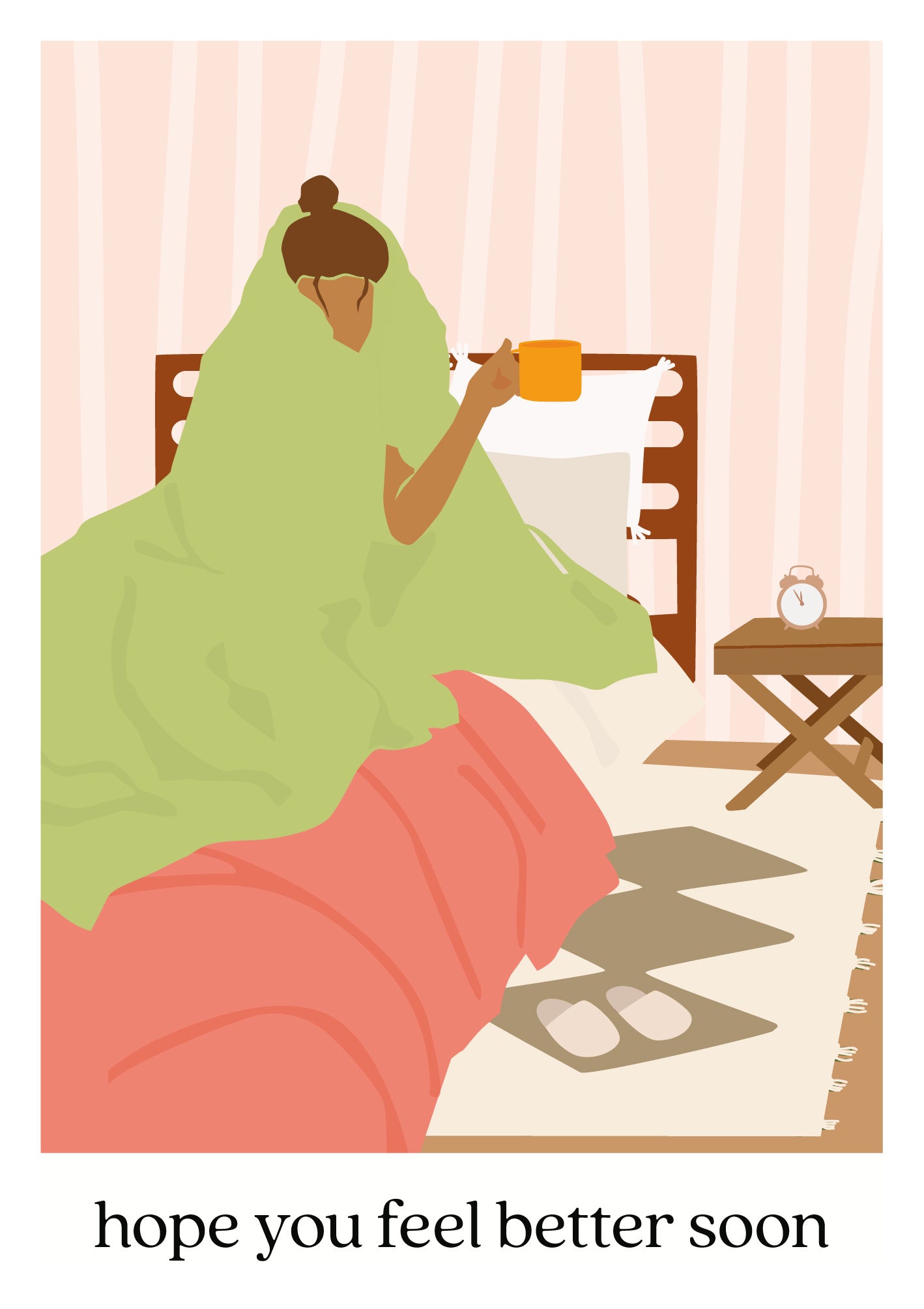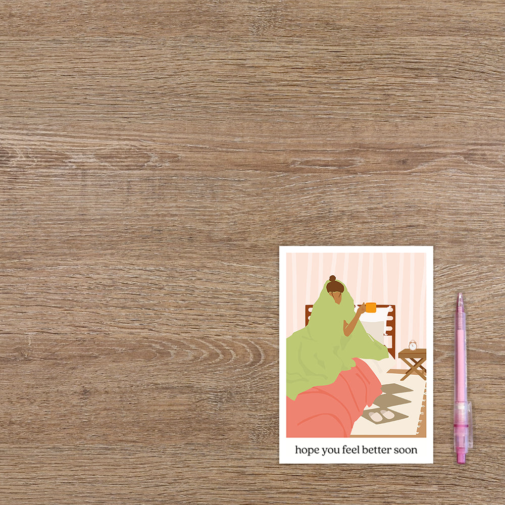 De wenskaart heeft een afmeting van x en een staande vorm. Op deze wenskaart staat een vrouw die in bed ligt met een deken over haar heen en een mok in de hand. Onder de illustratie staat de tekst: "Hope you feel better soon". De binnenzijde van de wenskaart is bedrukt met een ontwerp passend bij de voorzijde van de kaart .