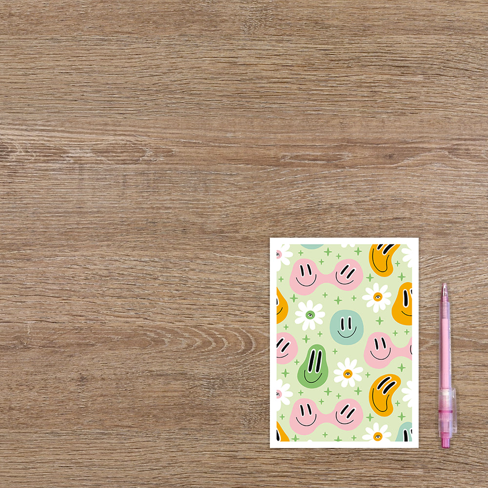 De wenskaart heeft een afmeting van x en een staande vorm. Op deze wenskaart staan smileys in de kleuren groen, blauw, roze en oranje met bloemen erom heen. De binnenzijde van de wenskaart is bedrukt met een ontwerp passend bij de voorzijde van de kaart .