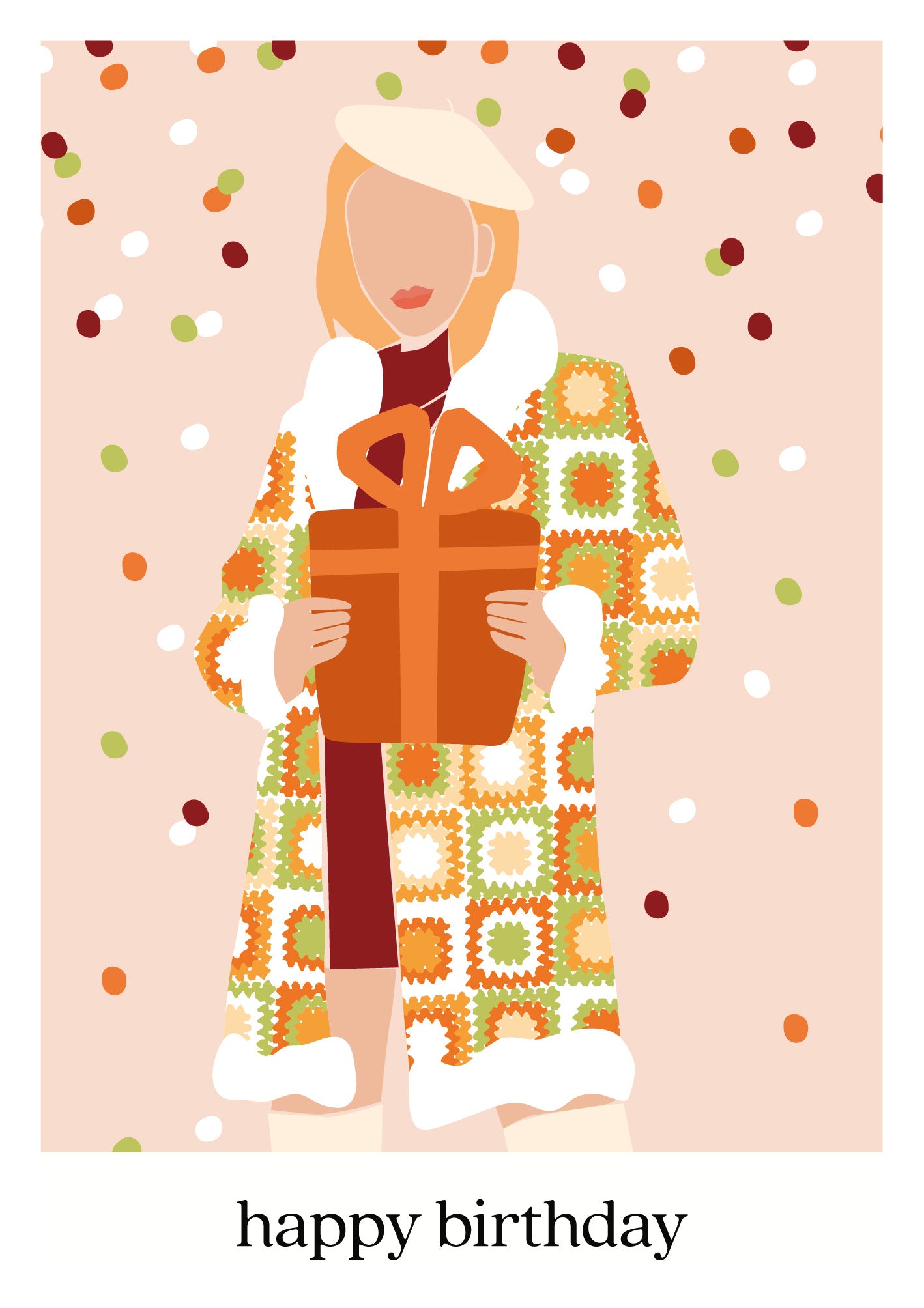 De wenskaart heeft een afmeting van x en een staande vorm. Op deze wenskaart staat een vrouw die een cadeau vasthoud. Onder de illustratie staat de tekst: "Happy birthday". De binnenzijde van de wenskaart is bedrukt met een ontwerp passend bij de voorzijde van de kaart .