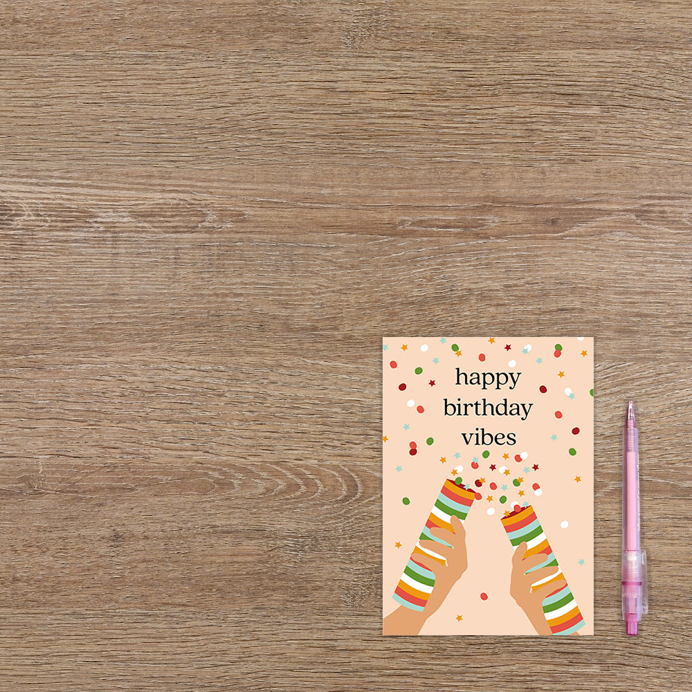 De wenskaart heeft een afmeting van x en een staande vorm. Op deze wenskaart staan twee confettikanonnen die confetti blazen. Bovenaan staat de tekst: "Happy birthday vibes". De binnenzijde van de wenskaart is bedrukt met een ontwerp passend bij de voorzijde van de kaart .