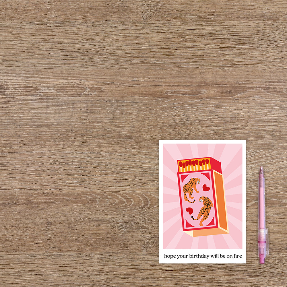 De wenskaart heeft een afmeting van x en een staande vorm. Op deze wenskaart staat een pakje lucifers met tijgers erop. Onder de illustratie staat de tekst: "Hope your birthday will be on fire". De binnenzijde van de wenskaart is bedrukt met een ontwerp passend bij de voorzijde van de kaart .