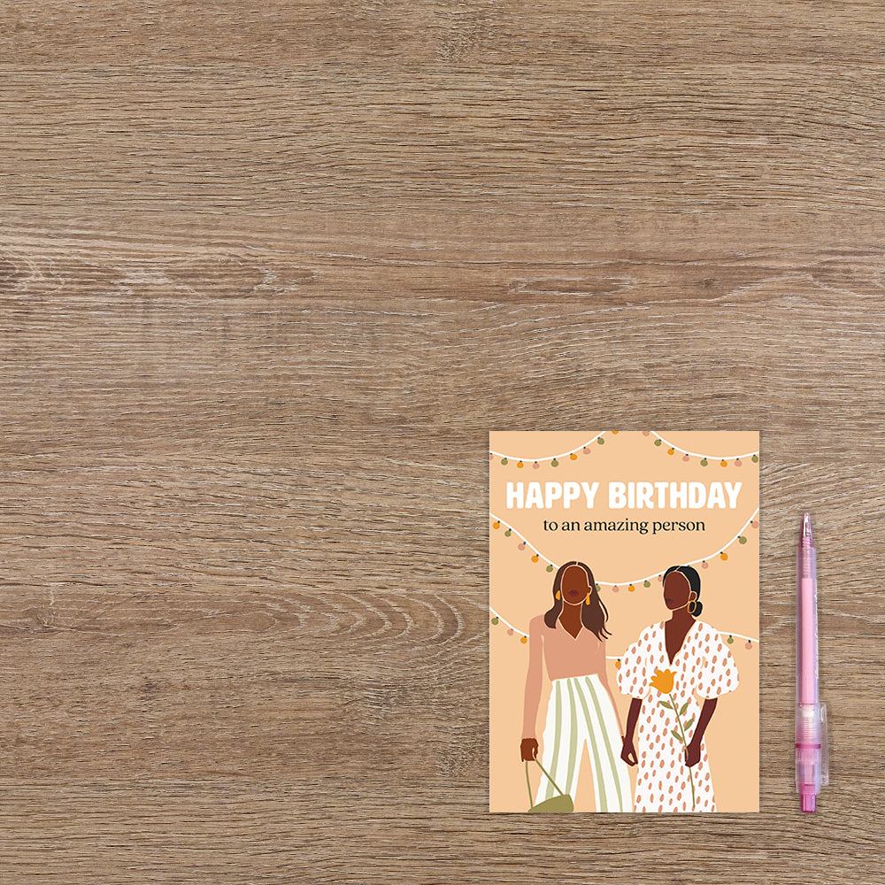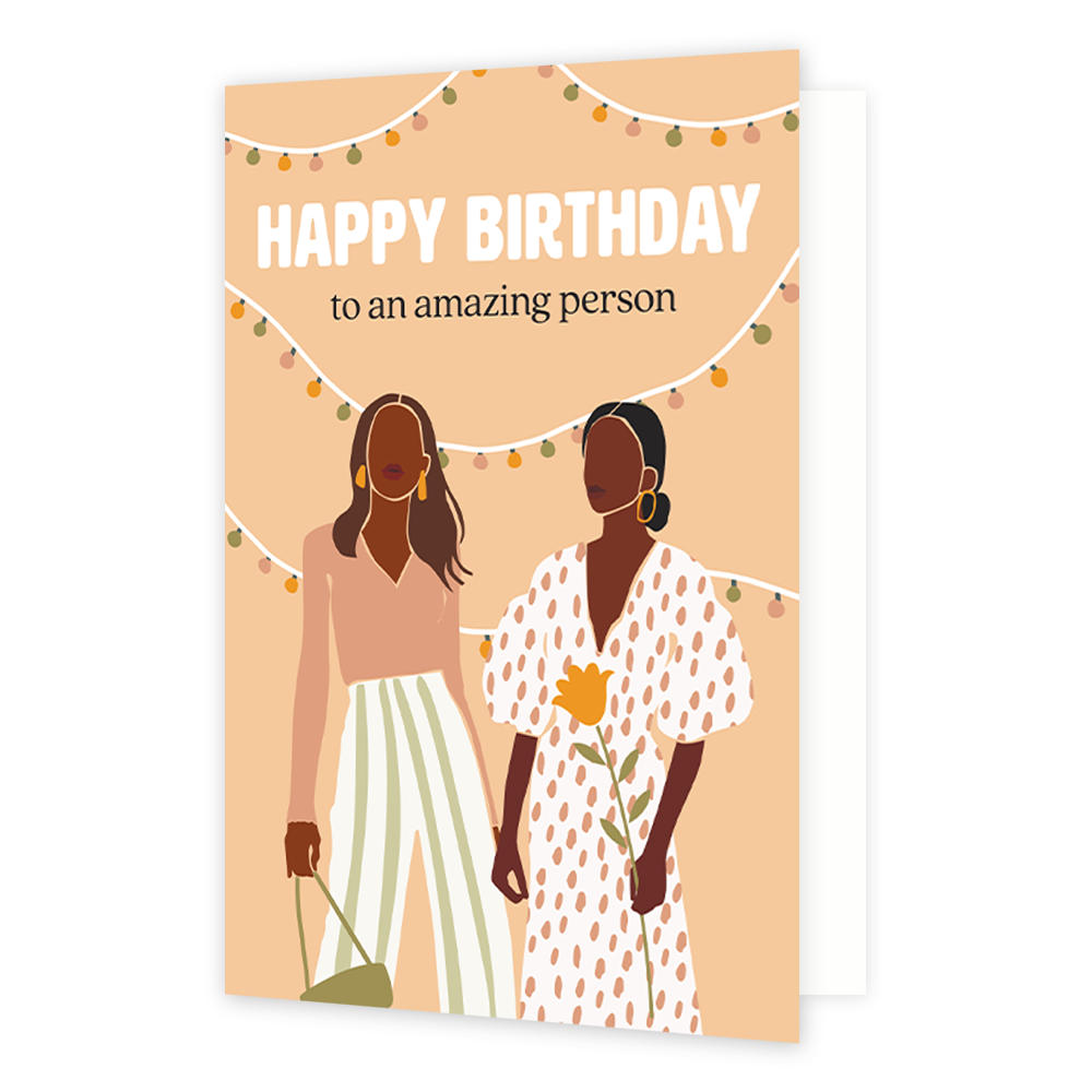 De wenskaart heeft een afmeting van x en een staande vorm. Op deze wenskaart staan twee dames met op de achtergrond slingers met lampjes. Bovenaan staat de tekst: "Happy birthday to an amazing person". De binnenzijde van de wenskaart is bedrukt met een ontwerp passend bij de voorzijde van de kaart .