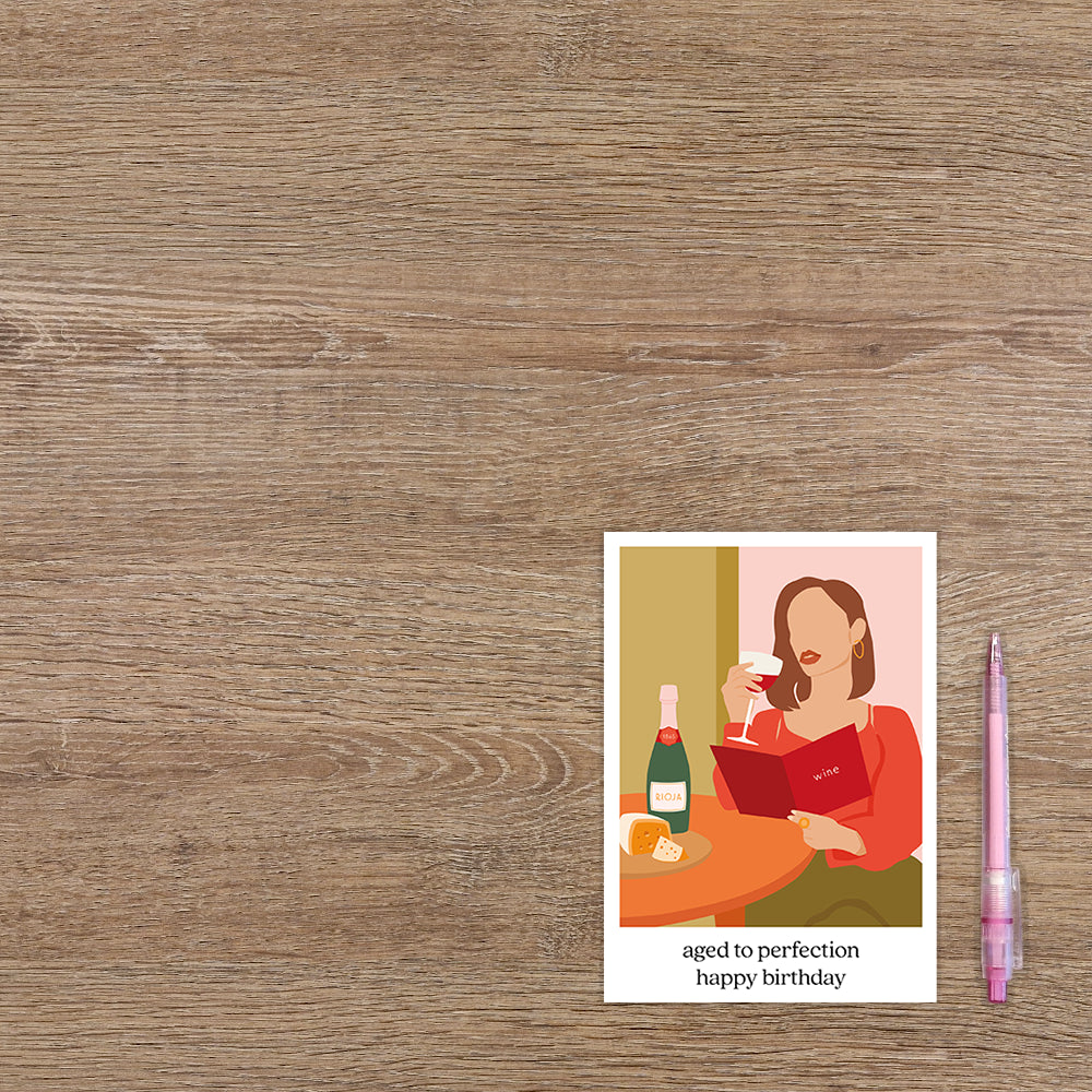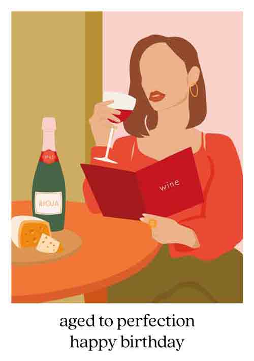 De wenskaart heeft een afmeting van x en een staande vorm. Op deze wenskaart staat een vrouw die een glas rode wijn drinkt terwijl ze op de wijnkaart kijkt. Onder de illustratie staat de tekst: "Aged to perfection happy birthday". De binnenzijde van de wenskaart is bedrukt met een ontwerp passend bij de voorzijde van de kaart .