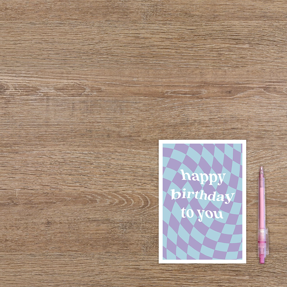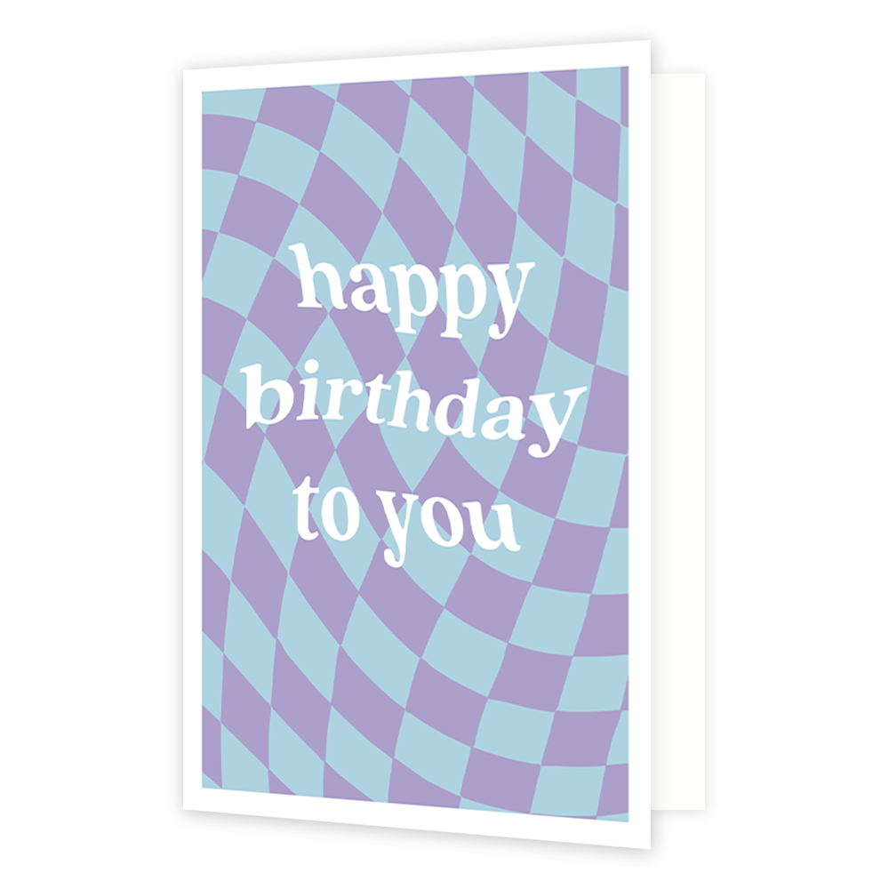 De wenskaart heeft een afmeting van x en een staande vorm. Op deze wenskaart staat een ontwerp met paarse en blauwe blokjes. In het midden staat de tekst: "Happy birthday to you". De binnenzijde van de wenskaart is bedrukt met een ontwerp passend bij de voorzijde van de kaart .