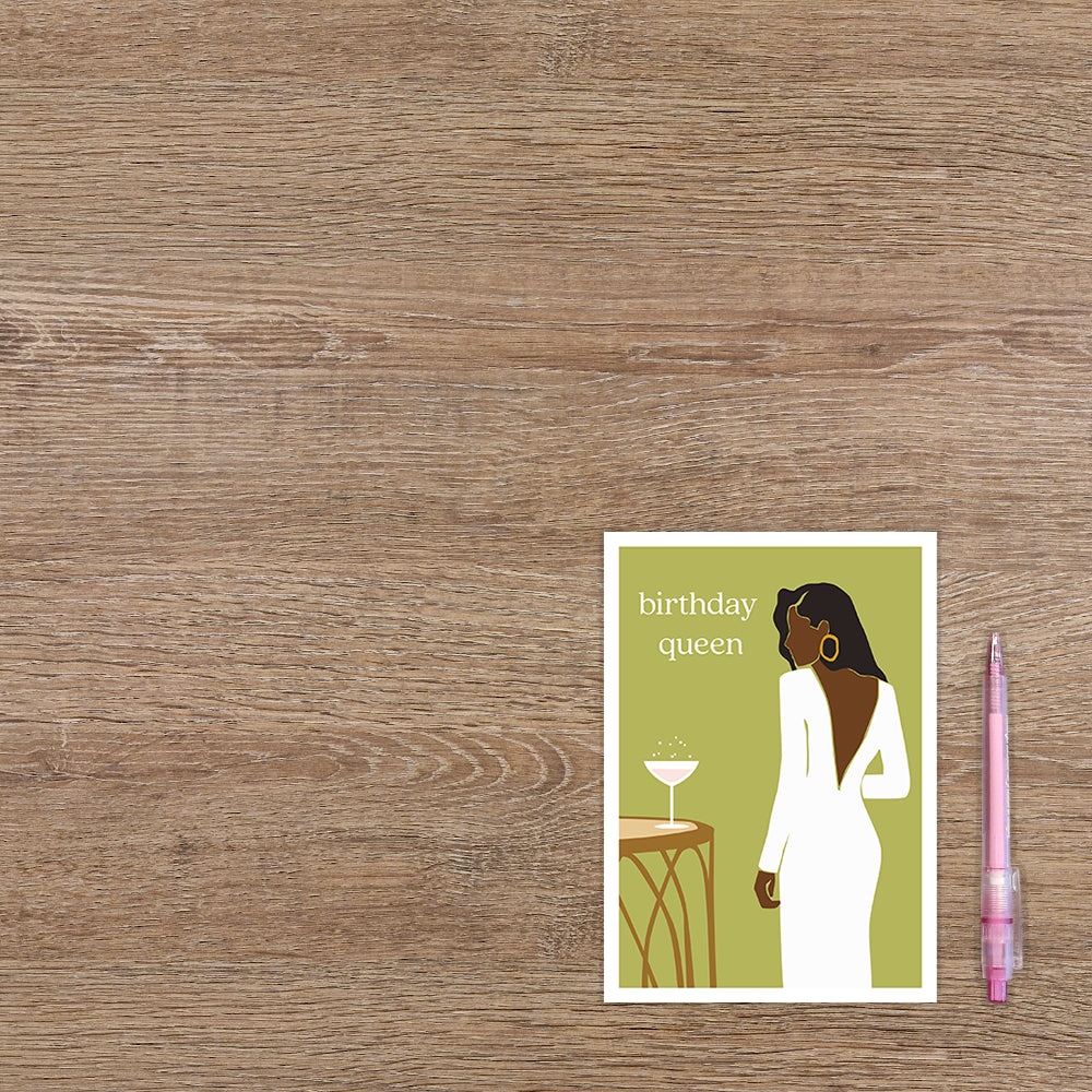 De wenskaart heeft een afmeting van x en een staande vorm. Op deze wenskaart staat een vrouw met een witte jurk. In de illustratie staat de tekst: "Birthday queen". De binnenzijde van de wenskaart is bedrukt met een ontwerp passend bij de voorzijde van de kaart .