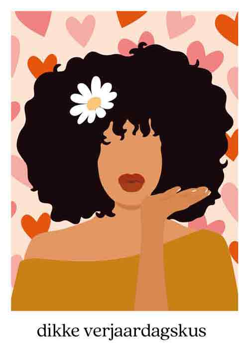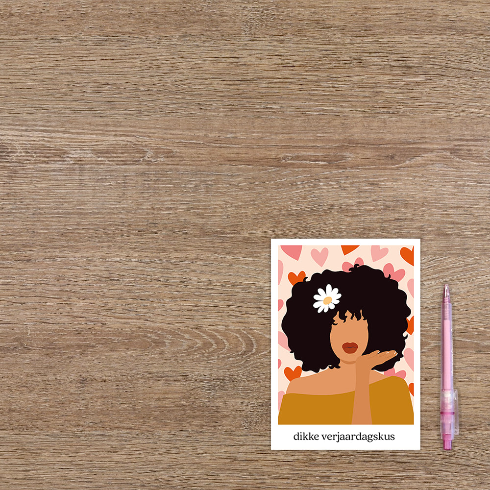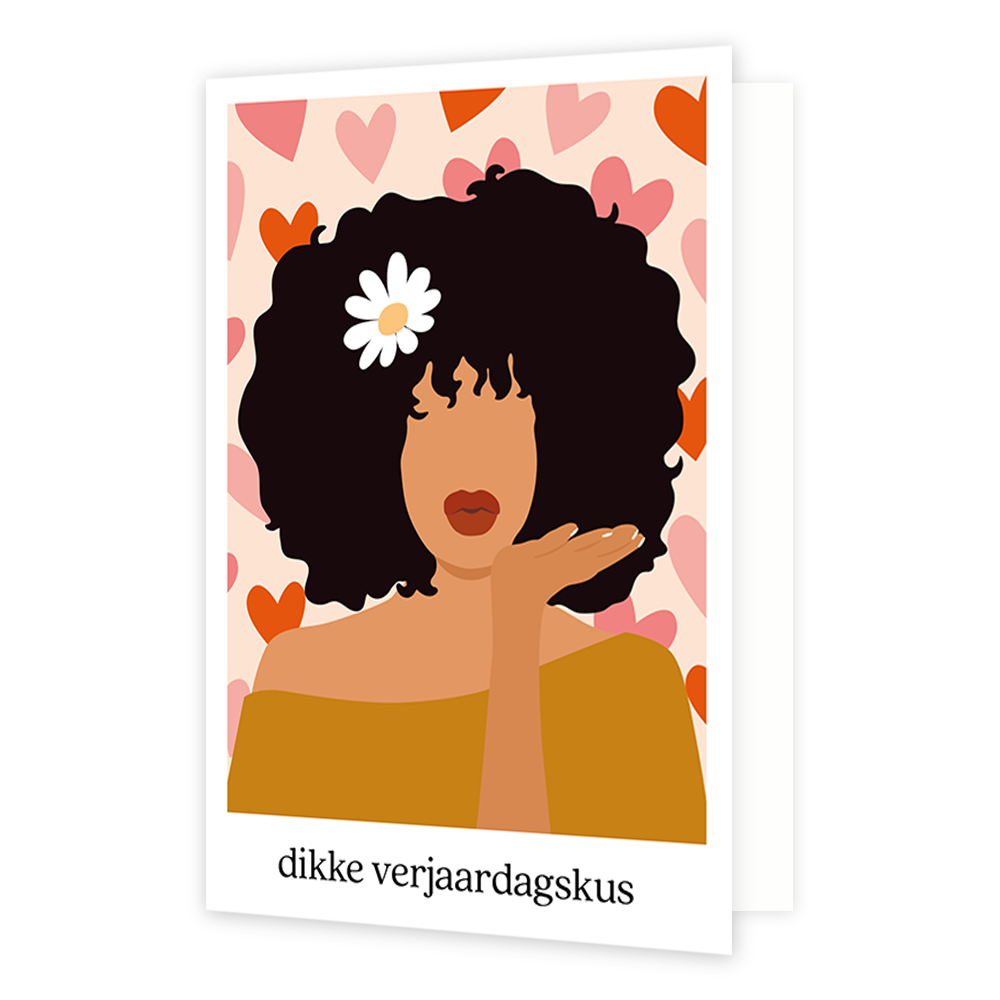 De wenskaart heeft een afmeting van x en een staande vorm. Op deze wenskaart staat een vrouw met donkere haren die een kus gebaar maakt met haar handen. Op de achtergrond zijn hartjes te zien en onder de illustratie staat de tekst: "Dikke verjaardagskus". De binnenzijde van de wenskaart is bedrukt met een ontwerp passend bij de voorzijde van de kaart .