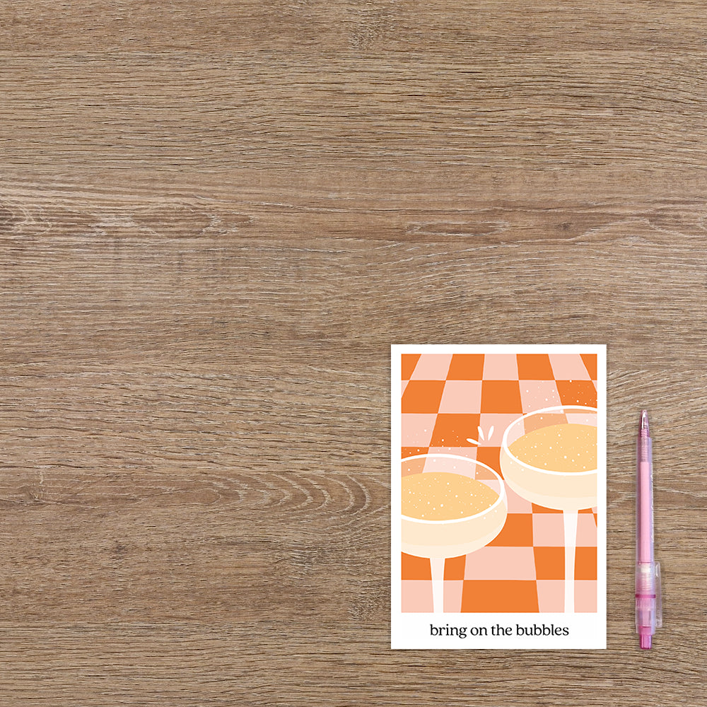 De wenskaart heeft een afmeting van x en een staande vorm. Op deze wenskaart staan twee champagneglazen. Onder de illustratie staat de tekst: "Bring on the bubbles". De binnenzijde van de wenskaart is bedrukt met een ontwerp passend bij de voorzijde van de kaart .