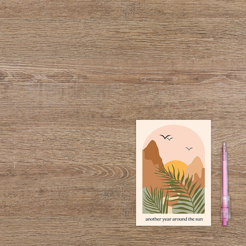 De wenskaart heeft een afmeting van x en een staande vorm. Op deze wenskaart staat een berglandschap met een opkomende zon. Onder de illustratie staat de tekst: "Another year around the sun". De binnenzijde van de wenskaart is bedrukt met een ontwerp passend bij de voorzijde van de kaart .