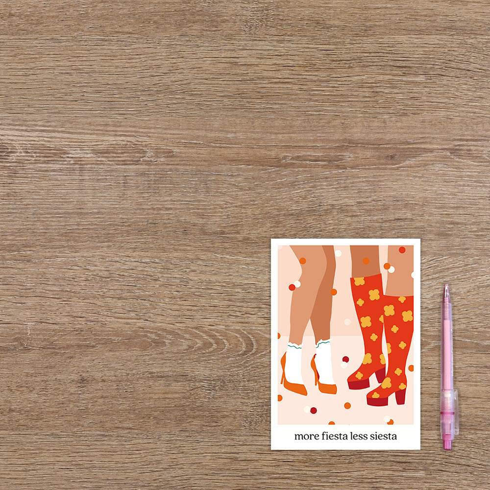 De wenskaart heeft een afmeting van x en een staande vorm. Op deze wenskaart staan twee voeten die pumps en laarzen met hakken aan hebben. Onder de illustratie staat de tekst: "More fiesta less siesta". De binnenzijde van de wenskaart is bedrukt met een ontwerp passend bij de voorzijde van de kaart .
