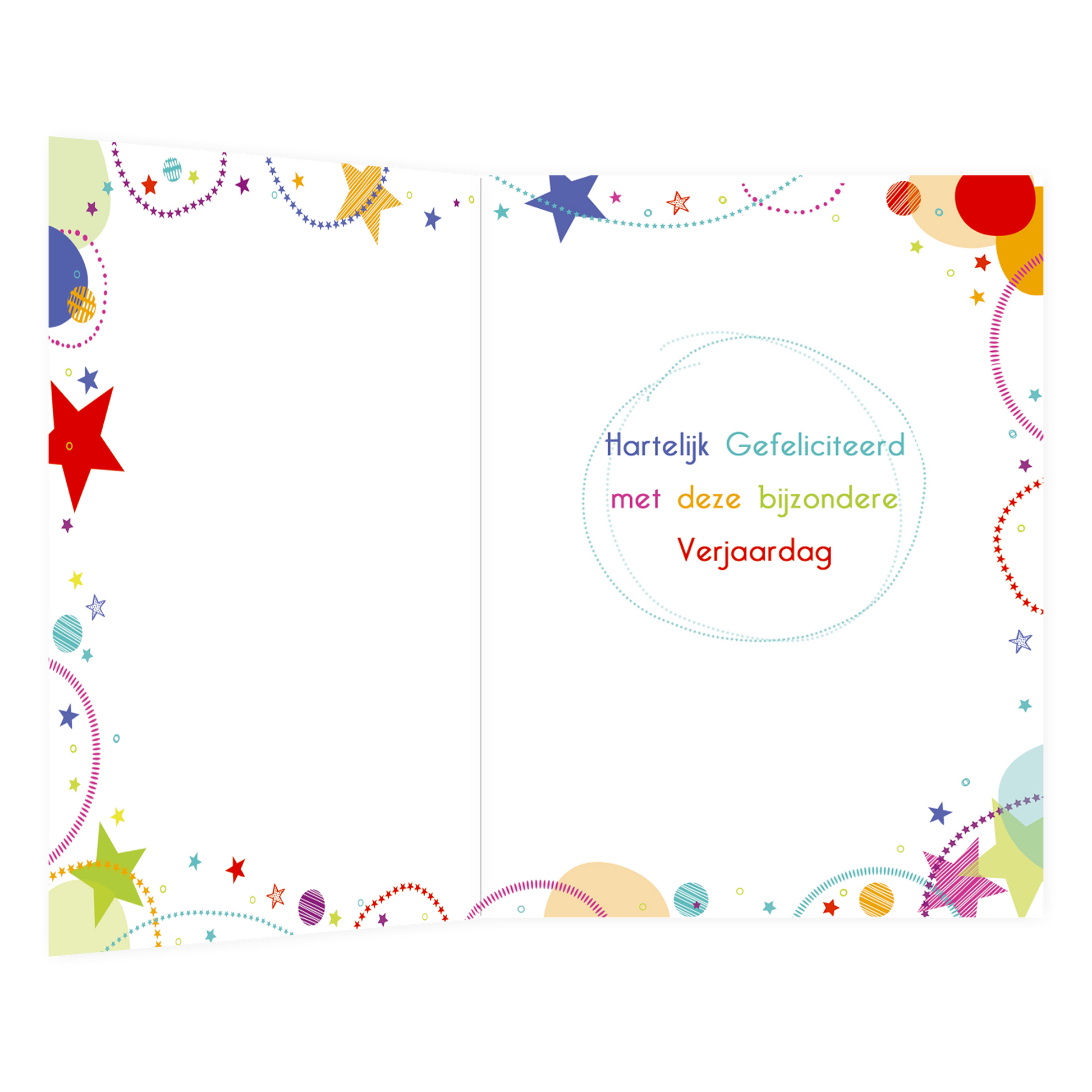 De wenskaart heeft een afmeting van x en een staande vorm. Op deze wenskaart staan sterren en stippen in diverse kleuren met in het midden de tekst: "50 jaar". De binnenzijde van de wenskaart is bedrukt met een ontwerp passend bij de voorzijde van de kaart en de tekst "Hartelijk gefeliciteerd met deze bijzondere verjaardag".