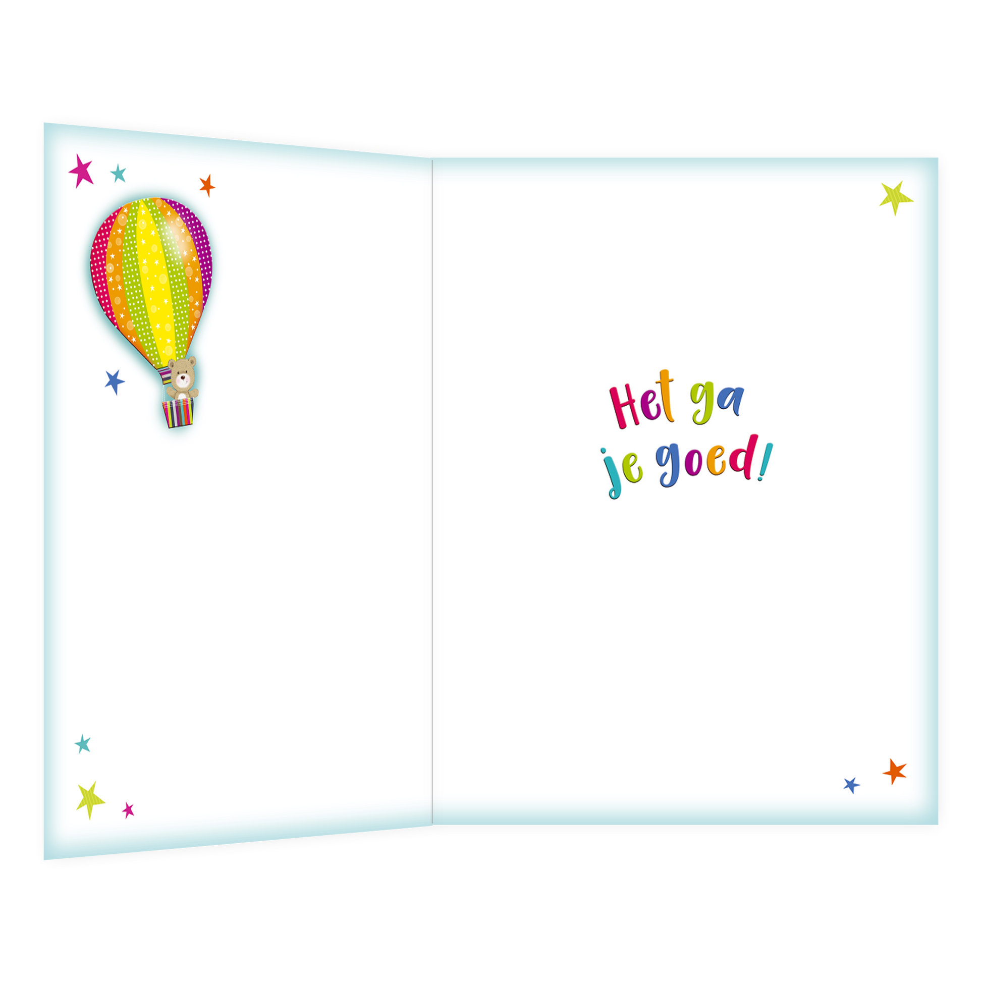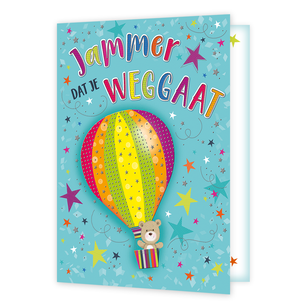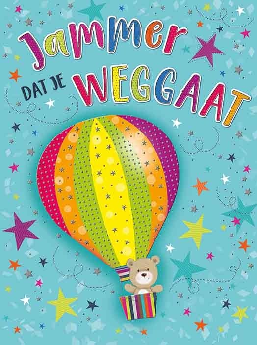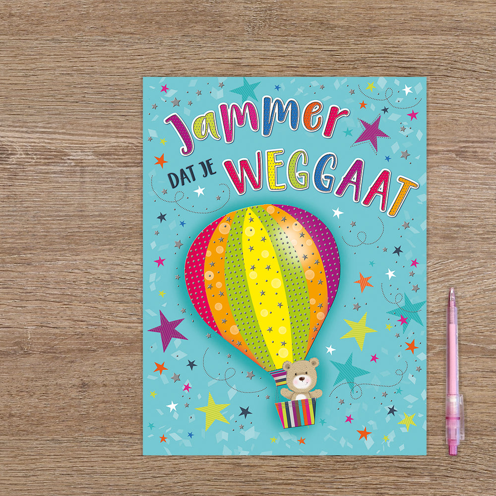 De wenskaart heeft een afmeting van x en een staande vorm. Op deze wenskaart staat een grote luchtballon met een beertje erin. Daarboven staat de tekst: "Jammer dat je weggaat". De binnenzijde van de wenskaart is bedrukt met een ontwerp passend bij de voorzijde van de kaart en de tekst "Het ga je goed!".