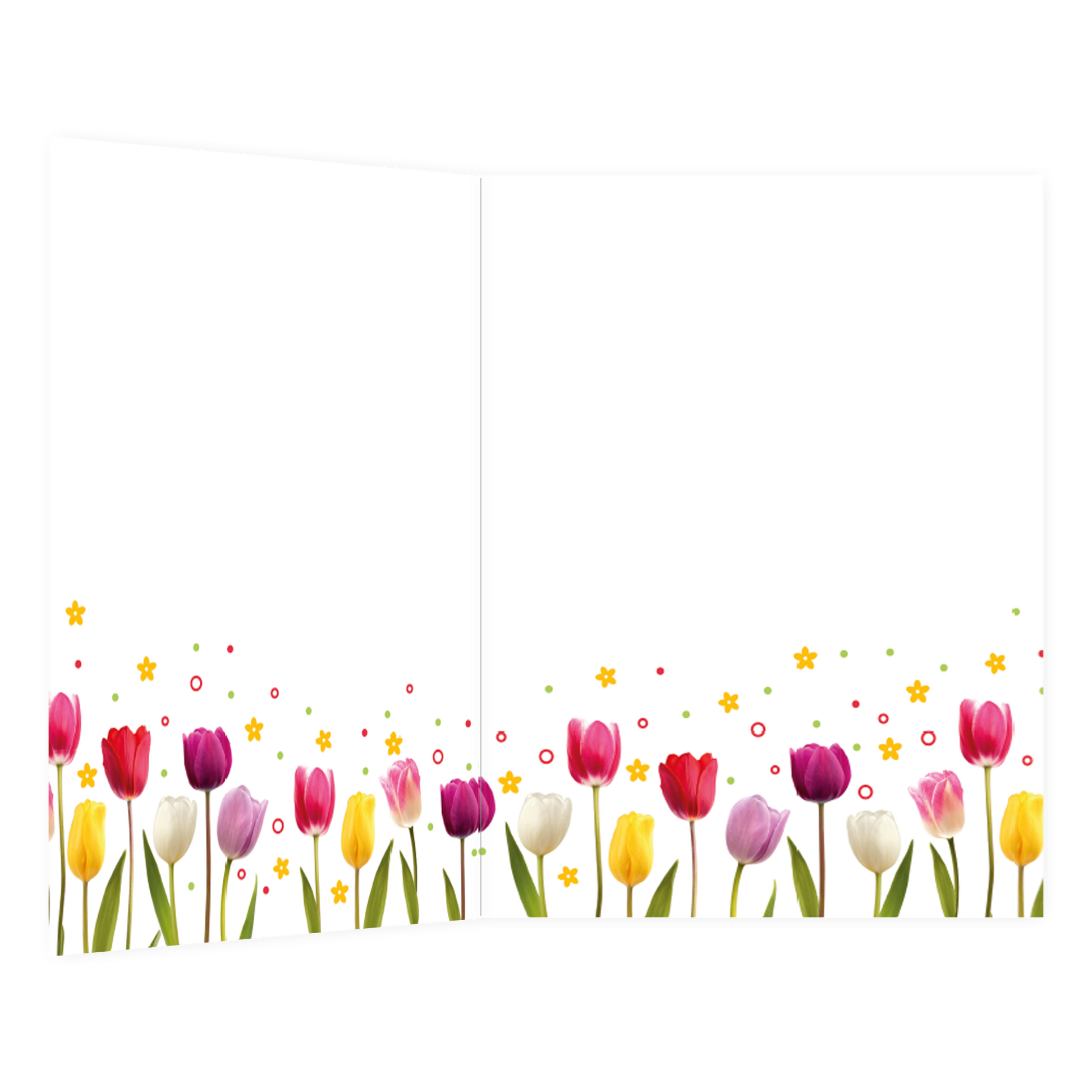 De wenskaart heeft een afmeting van x en een staande vorm. Op deze wenskaart staan tulpen in de kleuren roze,wit, geel en paars, met daarboven de tekst: "Gefeliciteerd". De binnenzijde van de wenskaart is bedrukt met een ontwerp passend bij de voorzijde van de kaart .