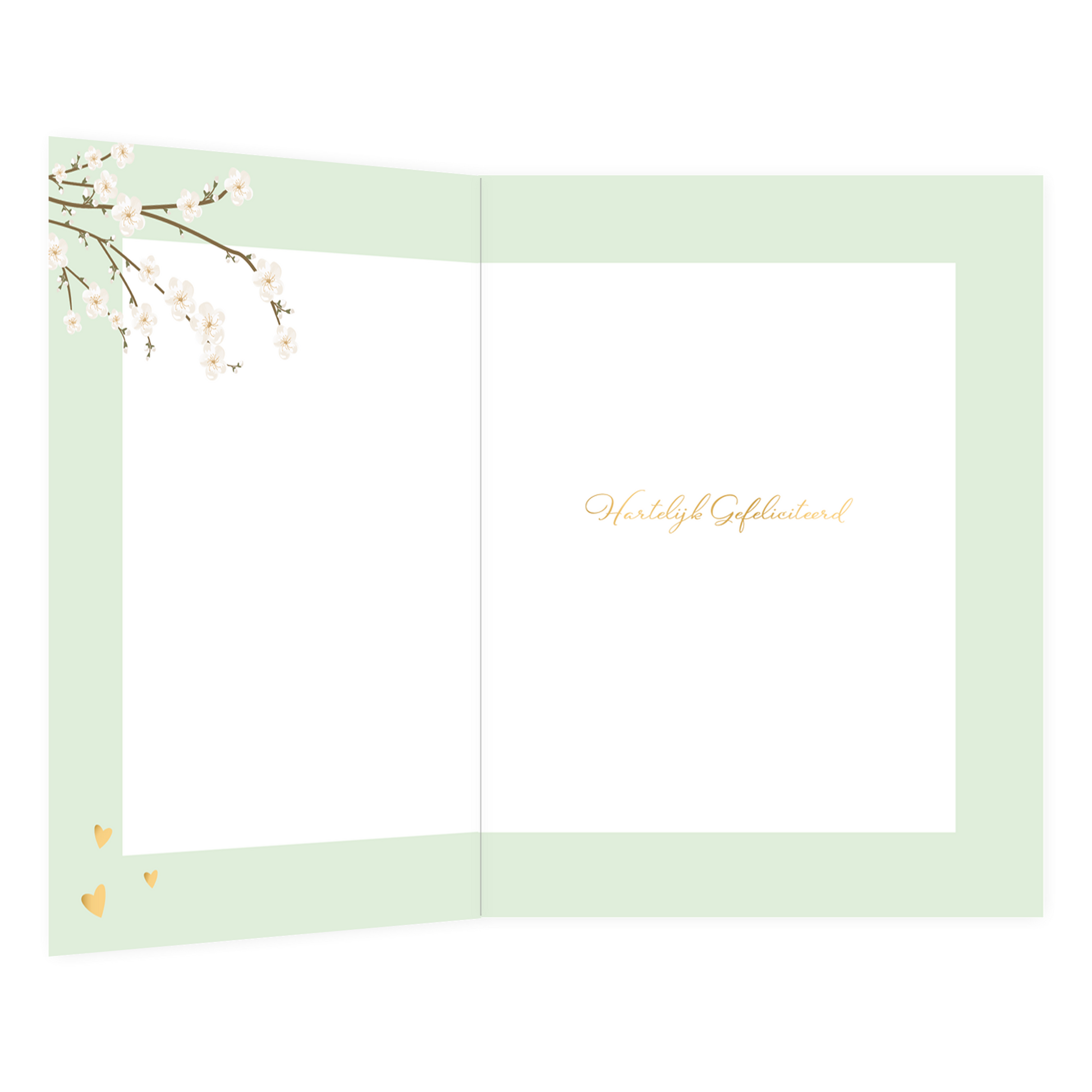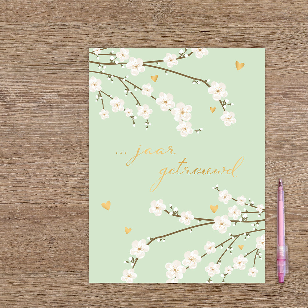 De wenskaart heeft een afmeting van 22.3cm x 29.8cm en een staande vorm. Op deze wenskaart zie je zowel links boven als rechtsonder takken met witte bloesem. Tussen de takken staan kleine gouden hartjes. De achtergrond is sage groen. In het midden staat de tekst in goud '... jaar getrouwd'. De binnenzijde van de wenskaart is bedrukt met een ontwerp passend bij de voorzijde van de kaart en de tekst"Hartelijk Gefeliciteerd".