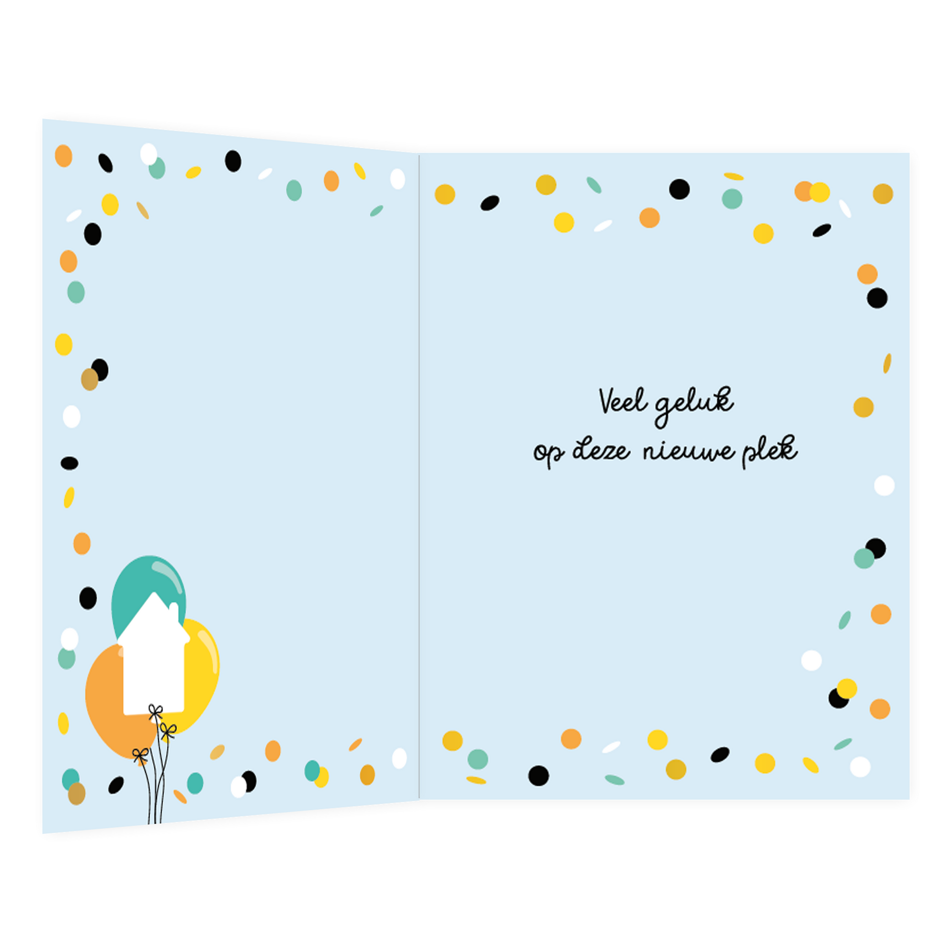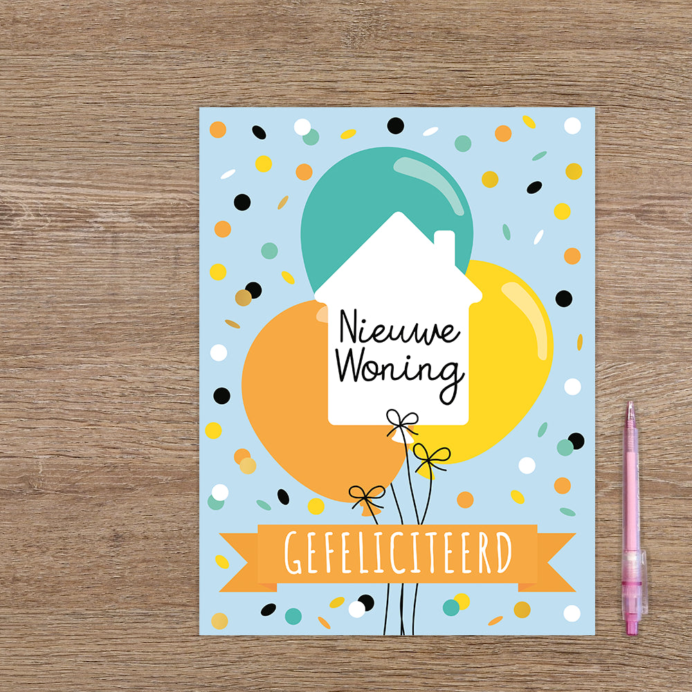 De wenskaart heeft een afmeting van x en een staande vorm. Op deze wenskaart staan ballonnen in de kleuren groen, oranje en geel met in het midden een wit huis. In de illustratie staat de tekst: "Nieuwe woning gefeliciteerd". De binnenzijde van de wenskaart is bedrukt met een ontwerp passend bij de voorzijde van de kaart en de tekst "Veel geluk op deze nieuwe plek".
