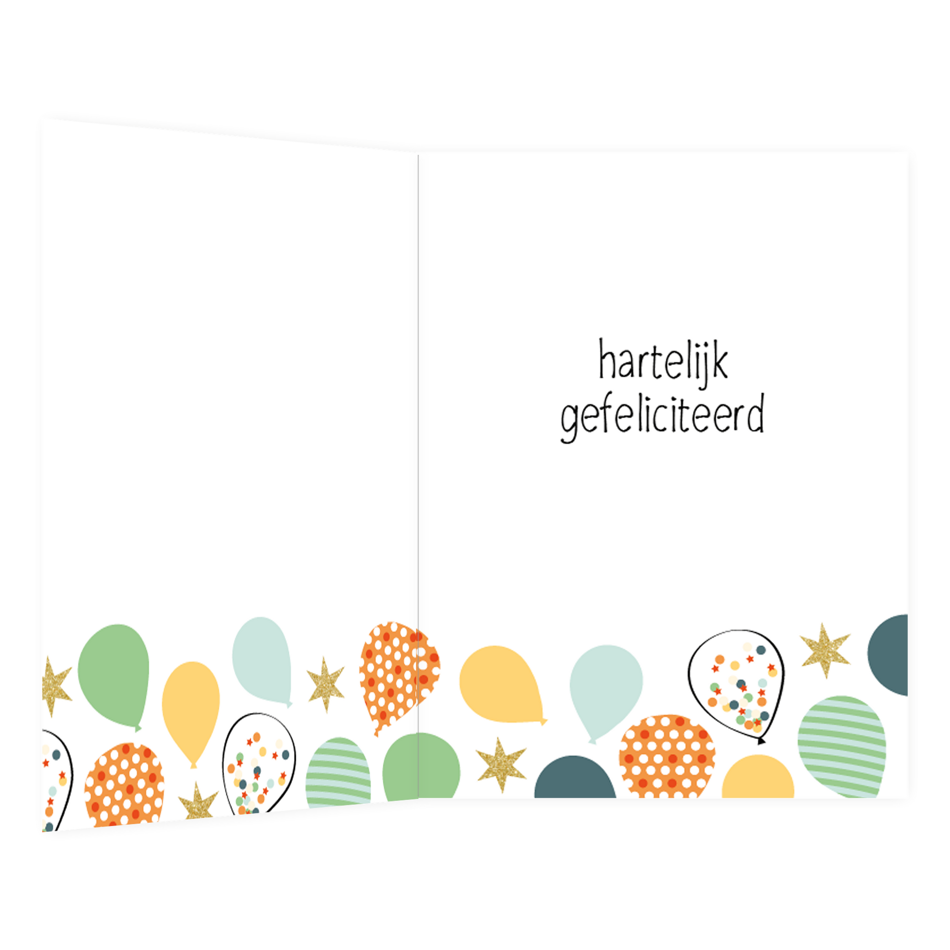 De wenskaart heeft een afmeting van x en een staande vorm. Op deze wenskaart staan ballonnen in de kleuren groen, oranje, geel, rood, wit en blauw. In het midden staat de tekst: "Voor de jarige". De binnenzijde van de wenskaart is bedrukt met een ontwerp passend bij de voorzijde van de kaart en de tekst "Hartelijk gefeliciteerd".