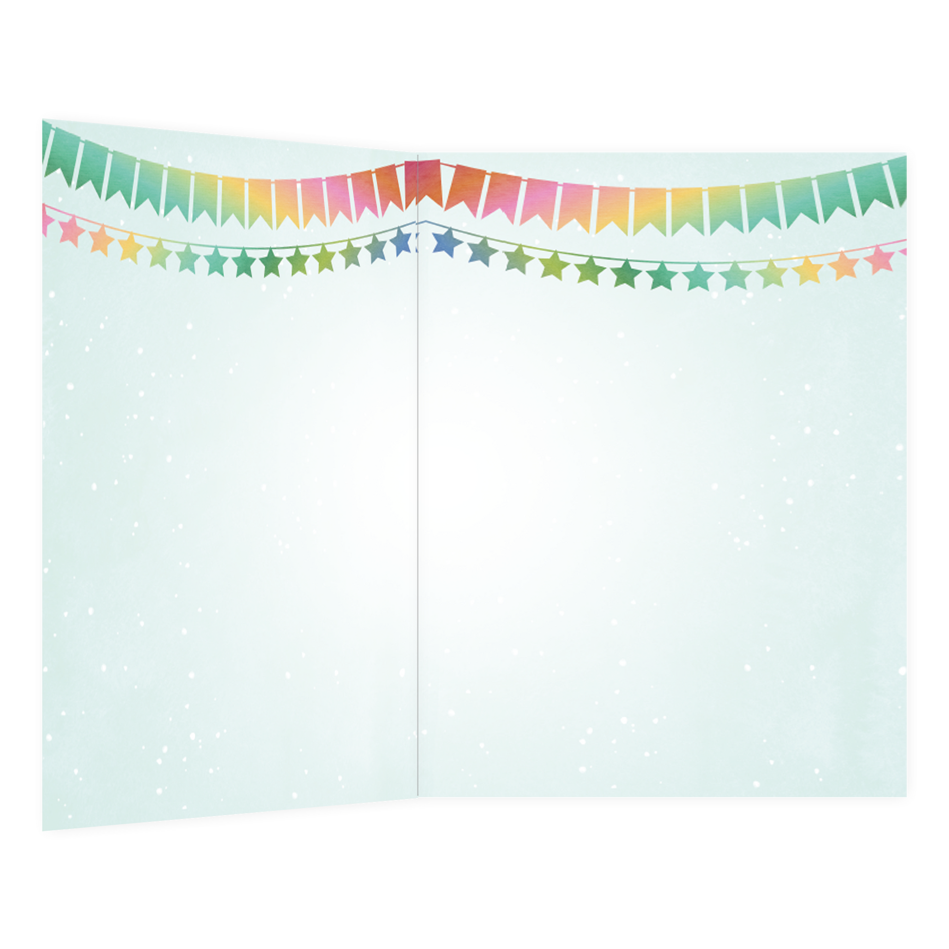 De wenskaart heeft een afmeting van x en een staande vorm. Op deze wenskaart staan slingers in de kleuren groen, geel, roze en oranje. In het midden staat de tekst: "Gefeliciteerd van ons allemaal". De binnenzijde van de wenskaart is bedrukt met een ontwerp passend bij de voorzijde van de kaart .
