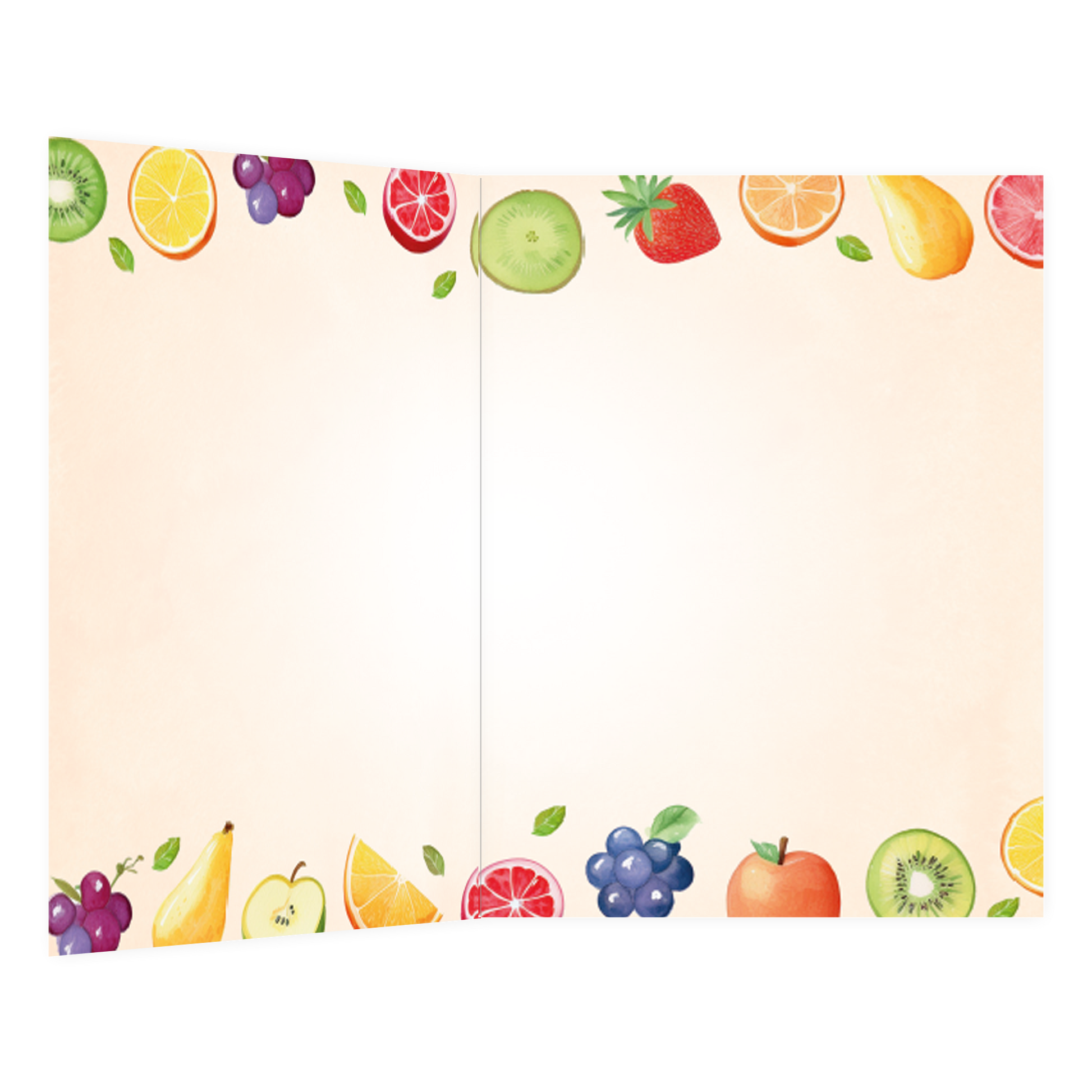 De wenskaart heeft een afmeting van x en een staande vorm. Op deze wenskaart staan diverse soorten fruit waaronder aarbeien, peren, kiwi's, appels en druiven. In het midden staat de tekst: "Van harte beterschap". De binnenzijde van de wenskaart is bedrukt met een ontwerp passend bij de voorzijde van de kaart .