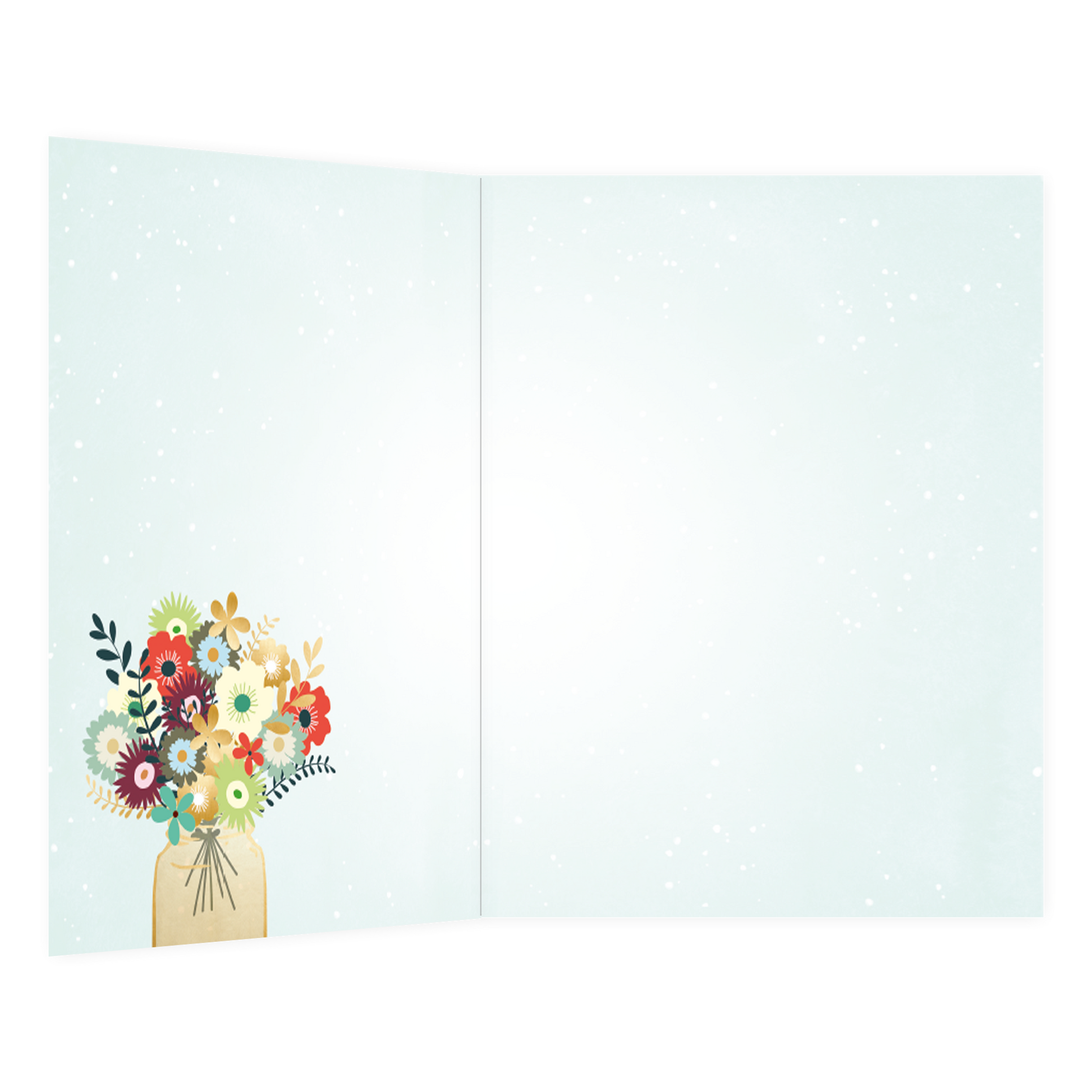 De wenskaart heeft een afmeting van x en een staande vorm. Op deze wenskaart staat een bos bloemen met de kleuren groen, goud, rood, paars en blauw. Boven de bos bloemen staat de tekst: "Thank you". De binnenzijde van de wenskaart is bedrukt met een ontwerp passend bij de voorzijde van de kaart .