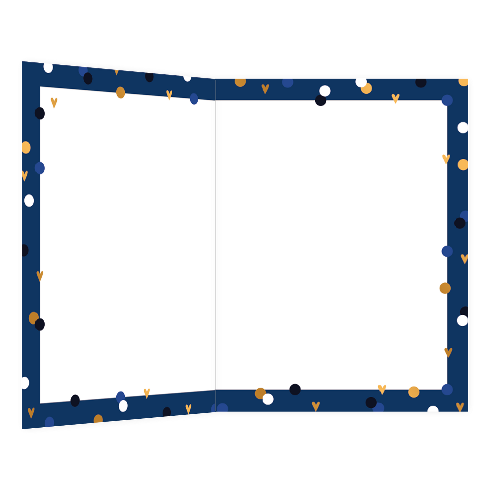 De wenskaart heeft een afmeting van x en een staande vorm. Op deze wenskaart staan stippen en hartjes mt in het midden de tekst: "To the happy couple". De binnenzijde van de wenskaart is bedrukt met een ontwerp passend bij de voorzijde van de kaart .
