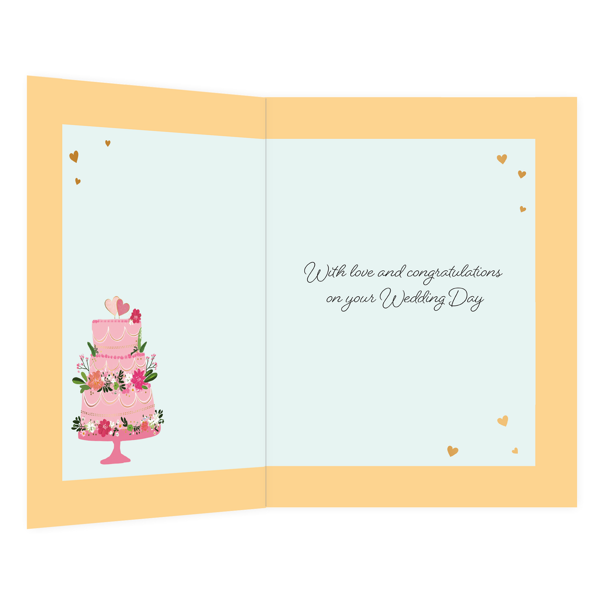 De wenskaart heeft een afmeting van x en een staande vorm. Op deze wenskaart staat een roze drielaagse bruidstaart met daarboven de tekst: "To the brand new mr & mrs". De binnenzijde van de wenskaart is blanco wat voldoende ruimte geeft om een persoonlijke boodschap te schrijven .