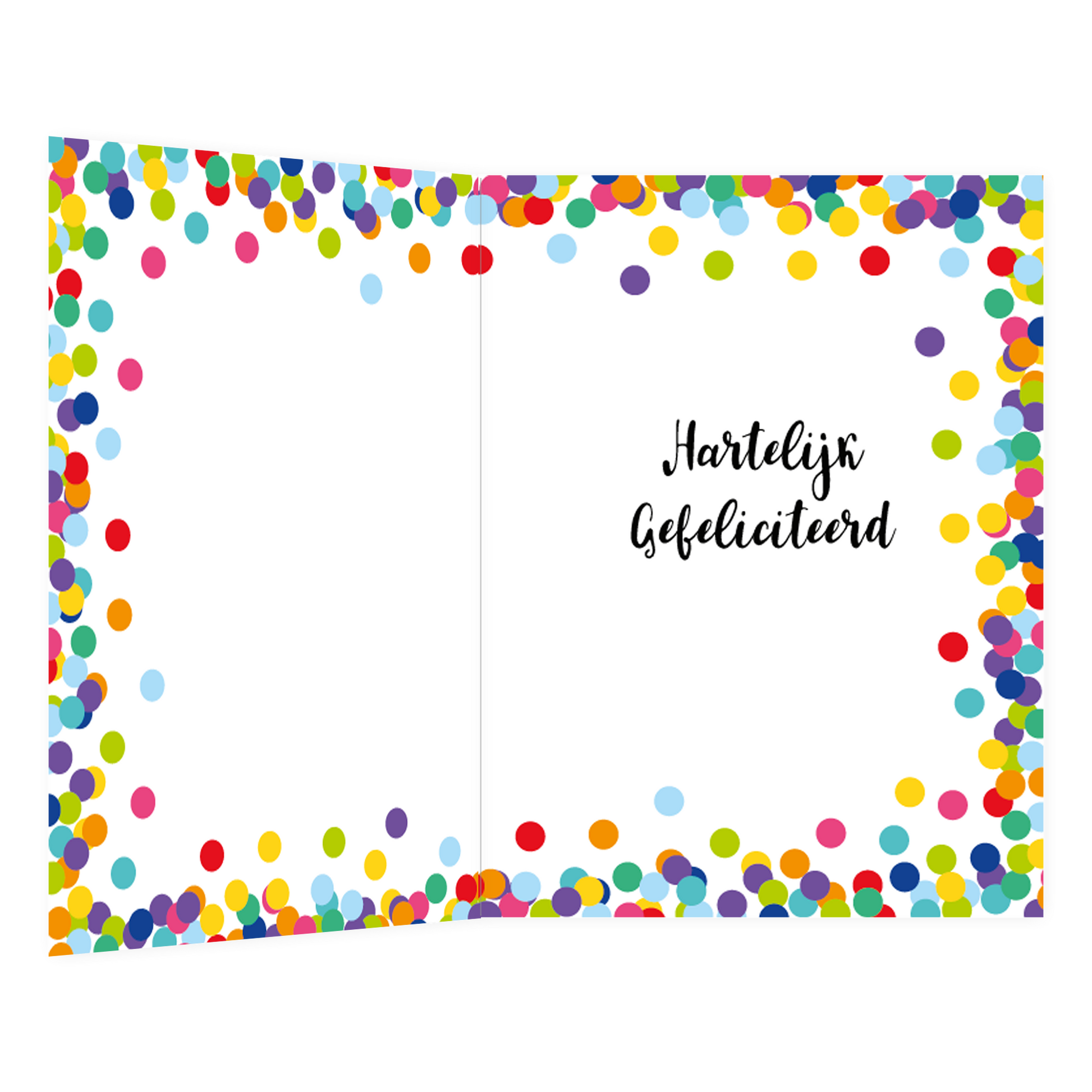 De wenskaart heeft een afmeting van x en een staande vorm. Op deze wenskaart staat confetti in diverse kleuren met de tekst: "16 jaar". De binnenzijde van de wenskaart is bedrukt met een ontwerp passend bij de voorzijde van de kaart en de tekst "Hartelijk gefeliciteerd".
