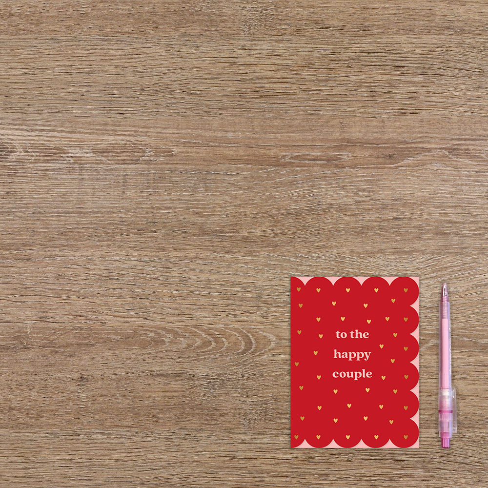 De wenskaart heeft een afmeting van x en een staande vorm. Op deze wenskaart staan gouden hartjes op een rode achtergrond met in het midden de tekst: "To the happy couple". De binnenzijde van de wenskaart is bedrukt met een ontwerp passend bij de voorzijde van de kaart .