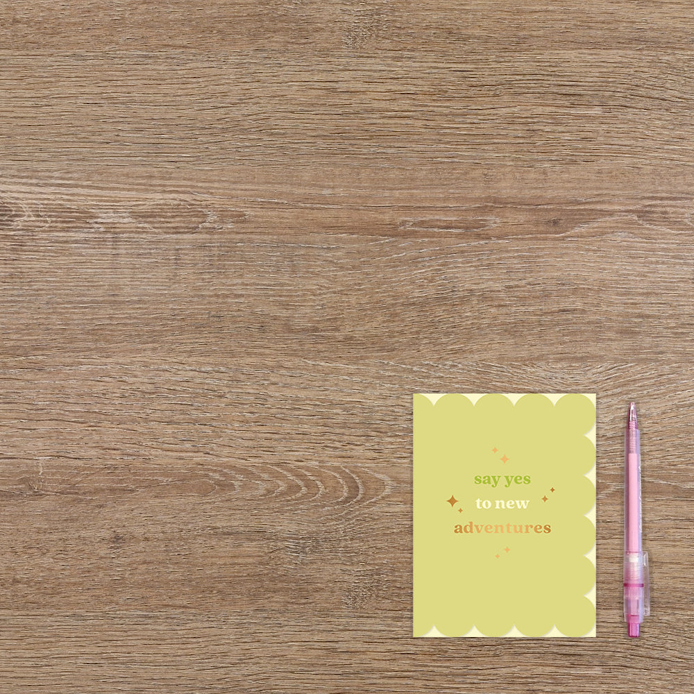 De wenskaart heeft een afmeting van x en een staande vorm. Op deze wenskaart staat de tekst: "Say yes to new adventures" op een groene achtergrond. De binnenzijde van de wenskaart is bedrukt met een ontwerp passend bij de voorzijde van de kaart .