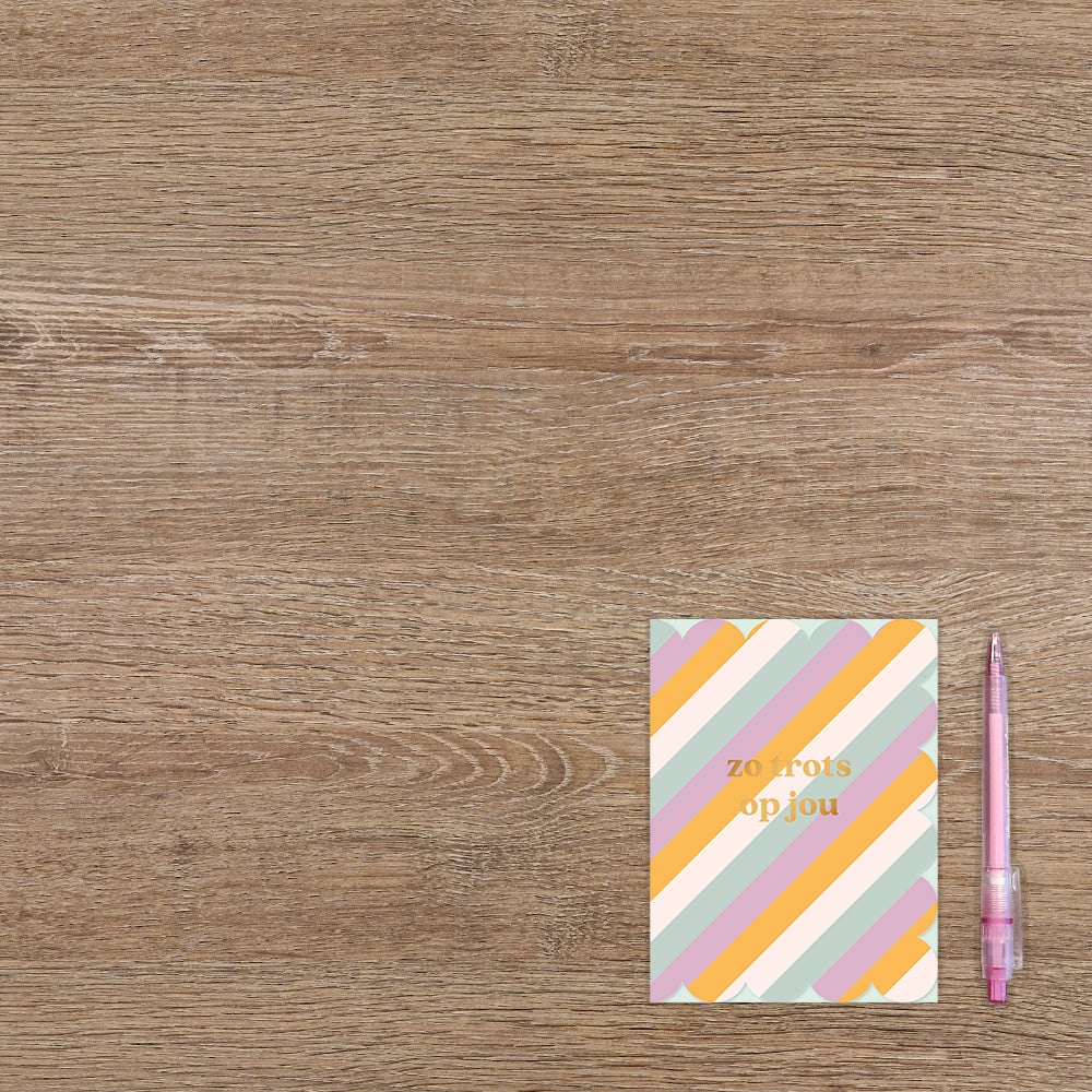 De wenskaart heeft een afmeting van x en een staande vorm. Op deze wenskaart staan lijnen in de kleuren paars, blauw, wit en geel, met in het midden de tekst: "Zo trots op jou". De binnenzijde van de wenskaart is bedrukt met een ontwerp passend bij de voorzijde van de kaart .