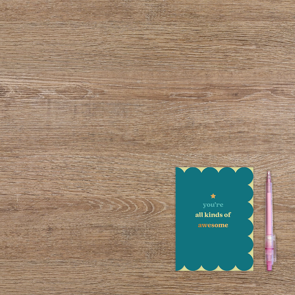 De wenskaart heeft een afmeting van x en een staande vorm. Op deze wenskaart staat de tekst: "You're all kinds of awesome" op een donkerblauwe achtergrond. De binnenzijde van de wenskaart is bedrukt met een ontwerp passend bij de voorzijde van de kaart .
