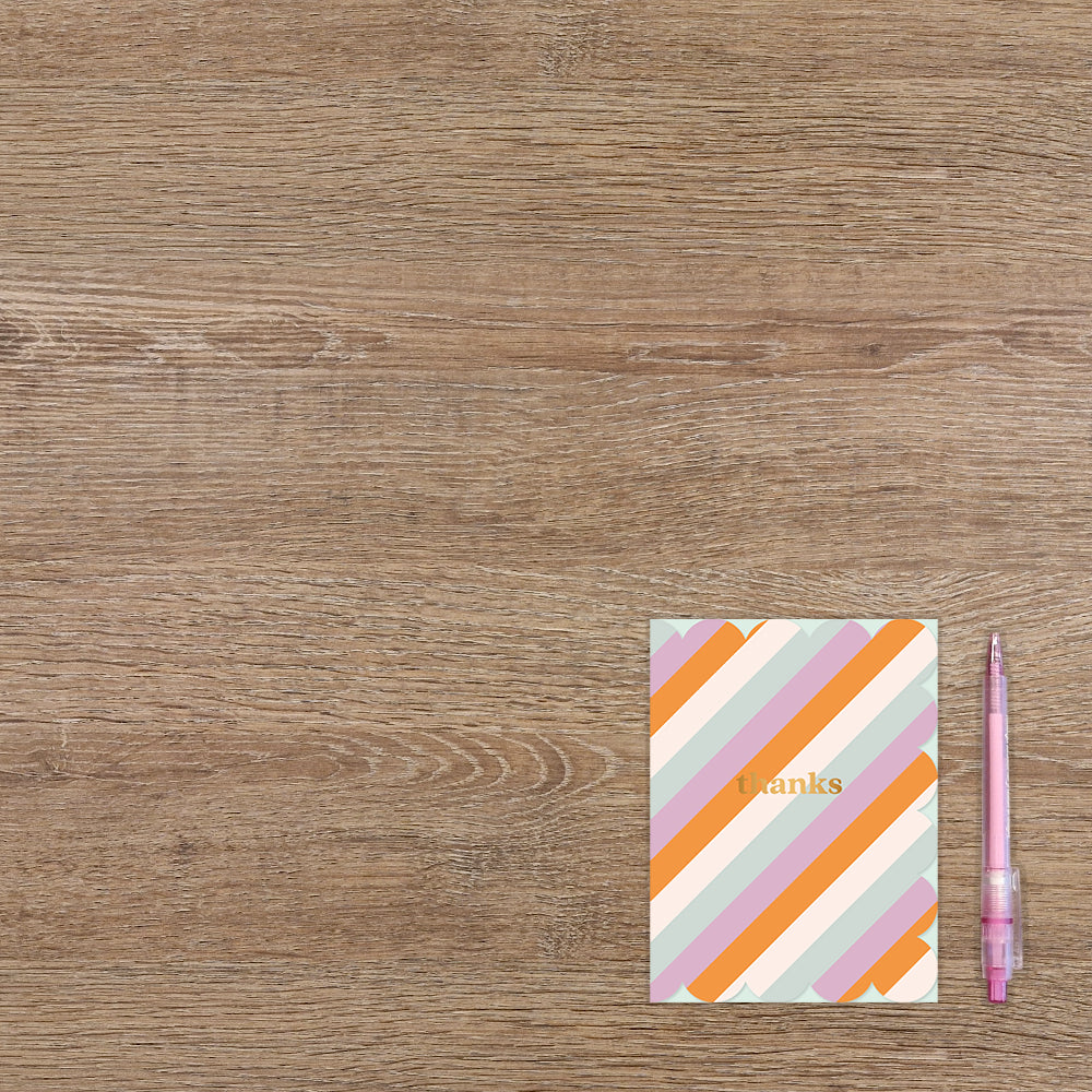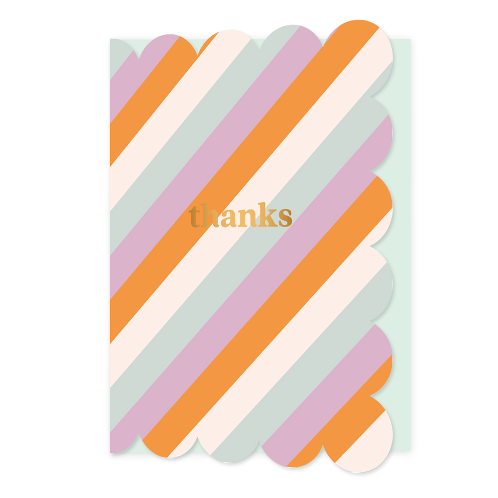 De wenskaart heeft een afmeting van x en een staande vorm. Op deze wenskaart staan lijnen in de kleuren oranje, groen, paars en oranje, met in het midden de tekst: "Thanks". De binnenzijde van de wenskaart is bedrukt met een ontwerp passend bij de voorzijde van de kaart .