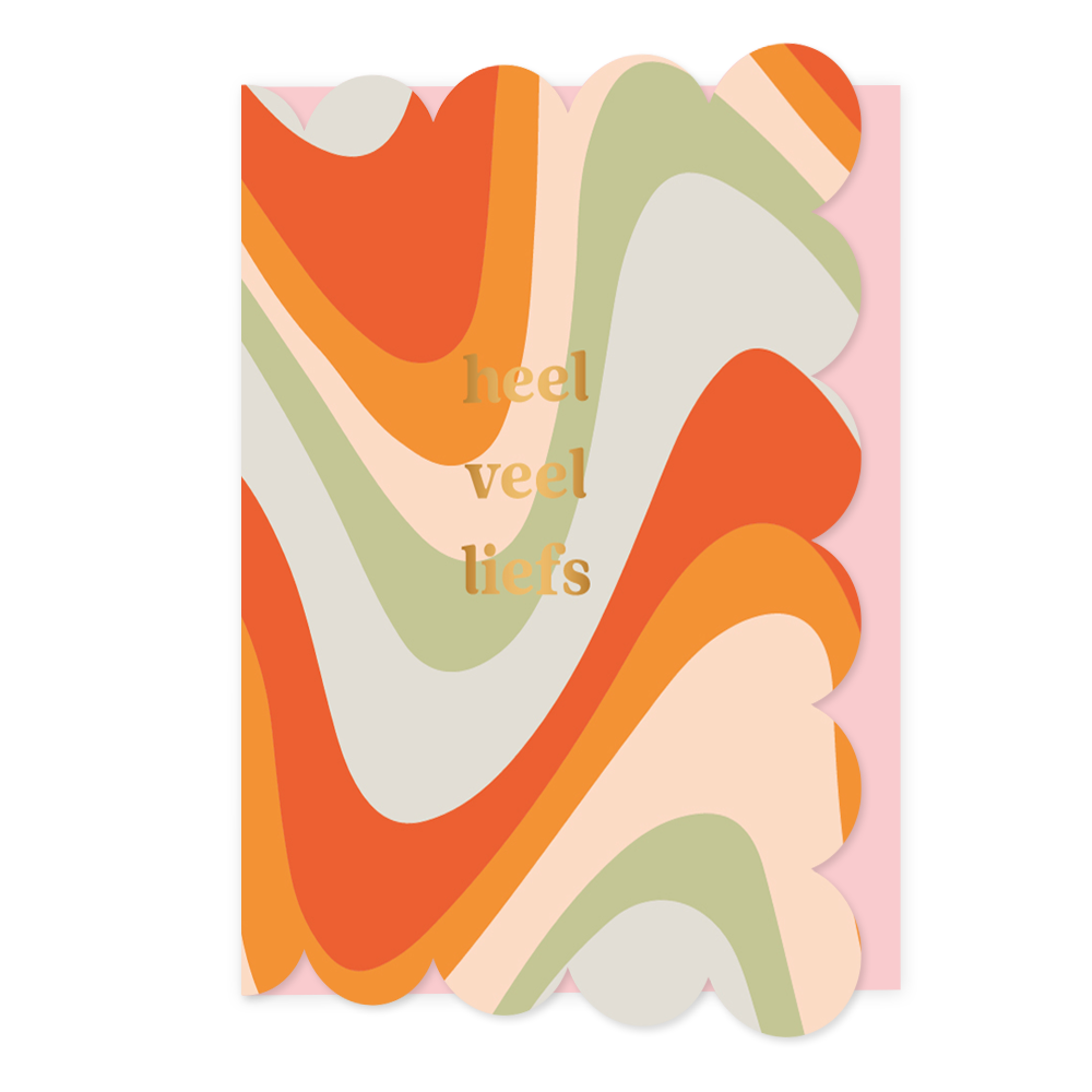 De wenskaart heeft een afmeting van x en een staande vorm. Op deze wenskaart staan lijnen in de kleuren rood, oranje, beige, groen en blauw, met in het midden de tekst: "Heel veel liefs". De binnenzijde van de wenskaart is bedrukt met een ontwerp passend bij de voorzijde van de kaart .