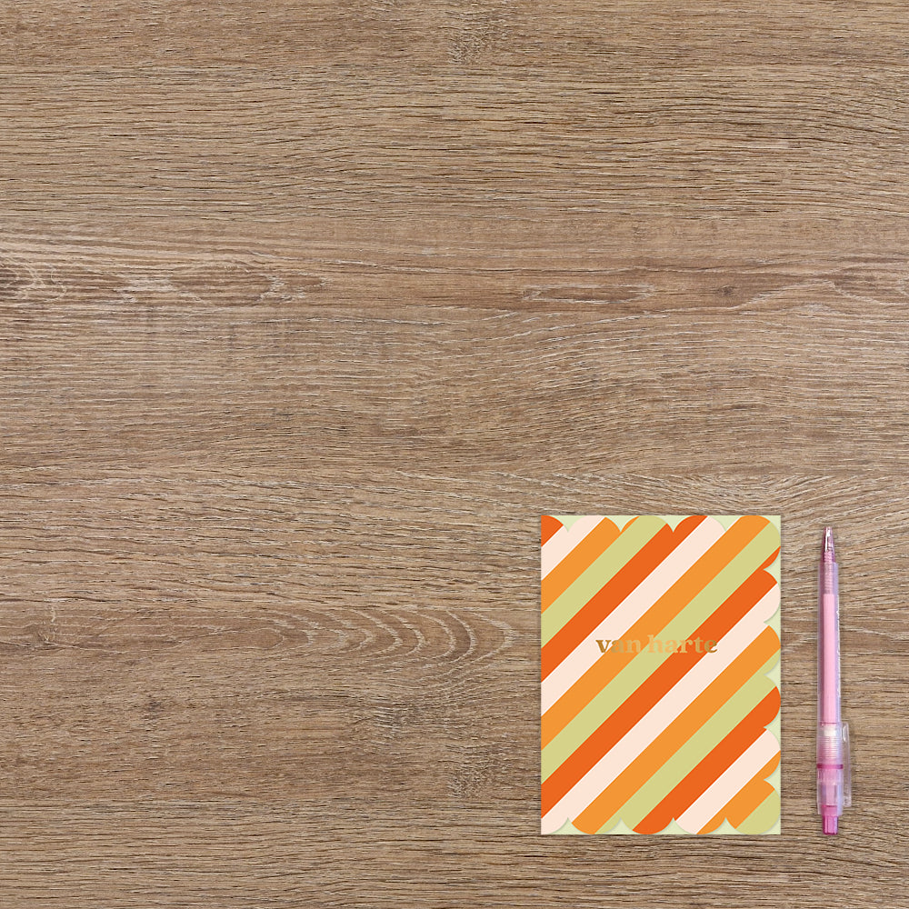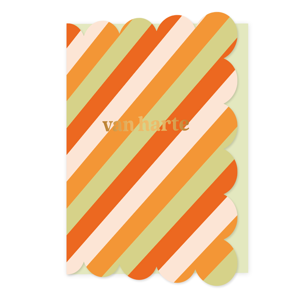 De wenskaart heeft een afmeting van x en een staande vorm. Op deze wenskaart staan lijnen in de kleuren rood, wit, oranje en groen, met in het midden de tekst: "Van harte". De binnenzijde van de wenskaart is bedrukt met een ontwerp passend bij de voorzijde van de kaart .