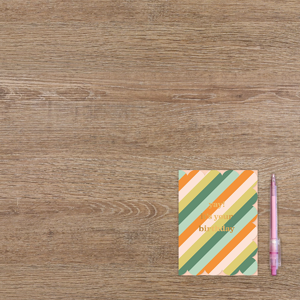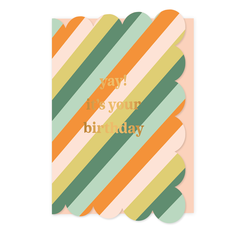 De wenskaart heeft een afmeting van x en een staande vorm. Op deze wenskaart staan lijnen in de kleuren wit, oranje, groen en blauw, met in het midden de tekst: "Yay! It's your birthday". De binnenzijde van de wenskaart is bedrukt met een ontwerp passend bij de voorzijde van de kaart .