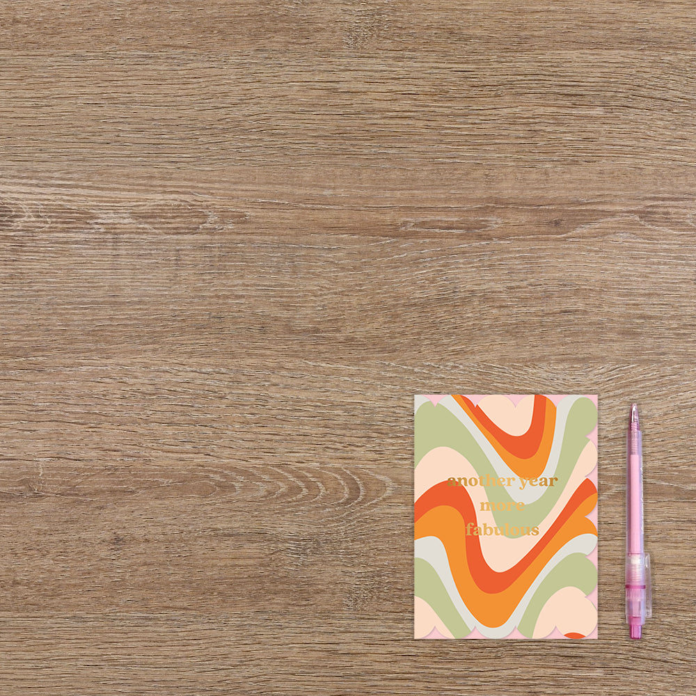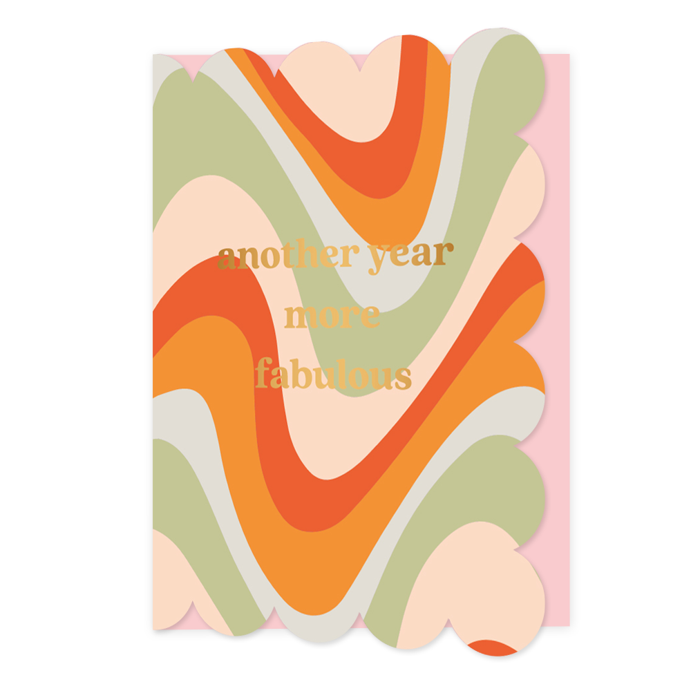 De wenskaart heeft een afmeting van x en een staande vorm. Op deze wenskaart staan lijnen in de kleuren beige, oranje, rood, blauw en groen, met in het midden de tekst: "Another year more fabulous". De binnenzijde van de wenskaart is bedrukt met een ontwerp passend bij de voorzijde van de kaart .