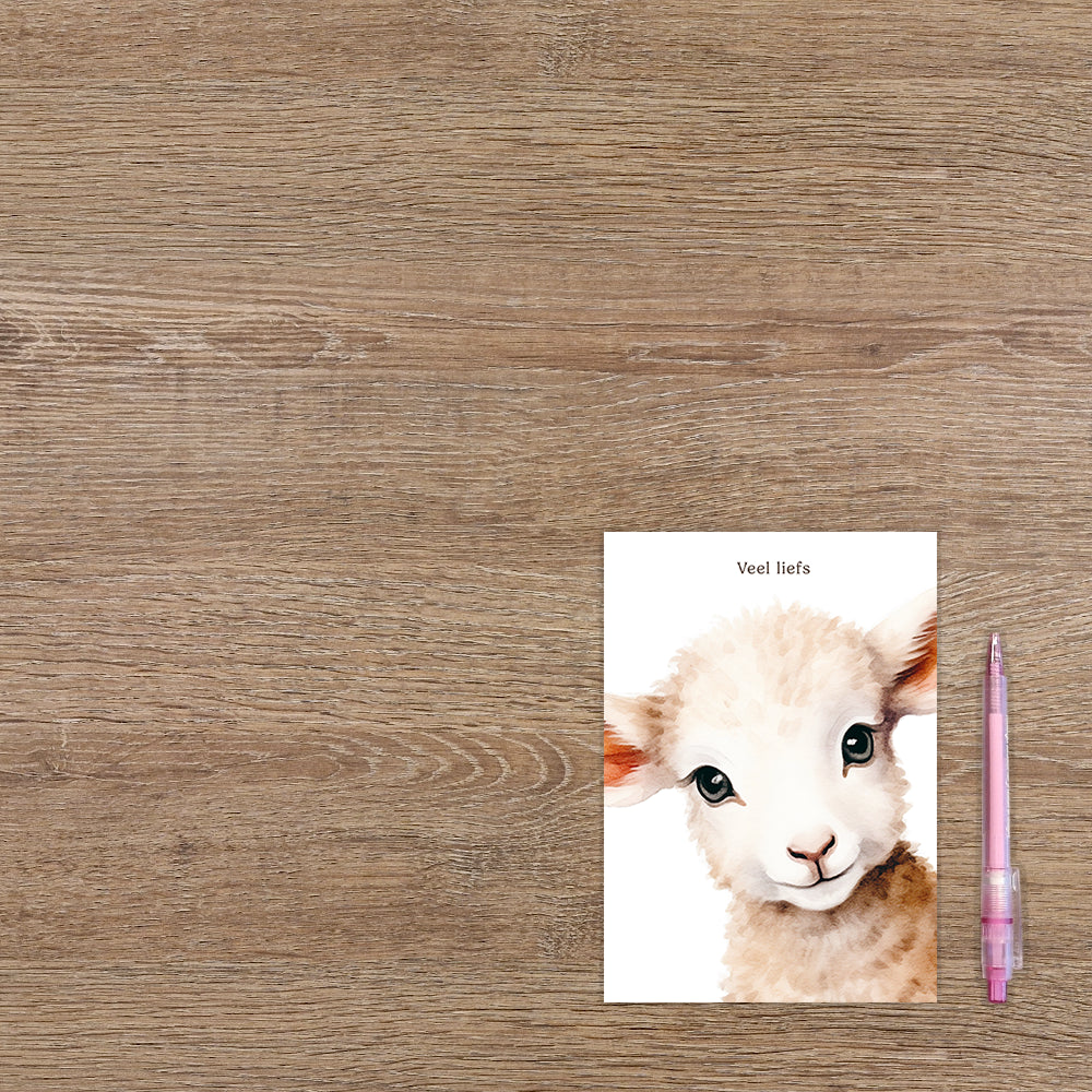 De wenskaart heeft een afmeting van x en een staande vorm. Op deze wenskaart staat een schaapje met daarboven de tekst: "Veel liefs". De binnenzijde van de wenskaart is blanco wat voldoende ruimte geeft om een persoonlijke boodschap te schrijven .
