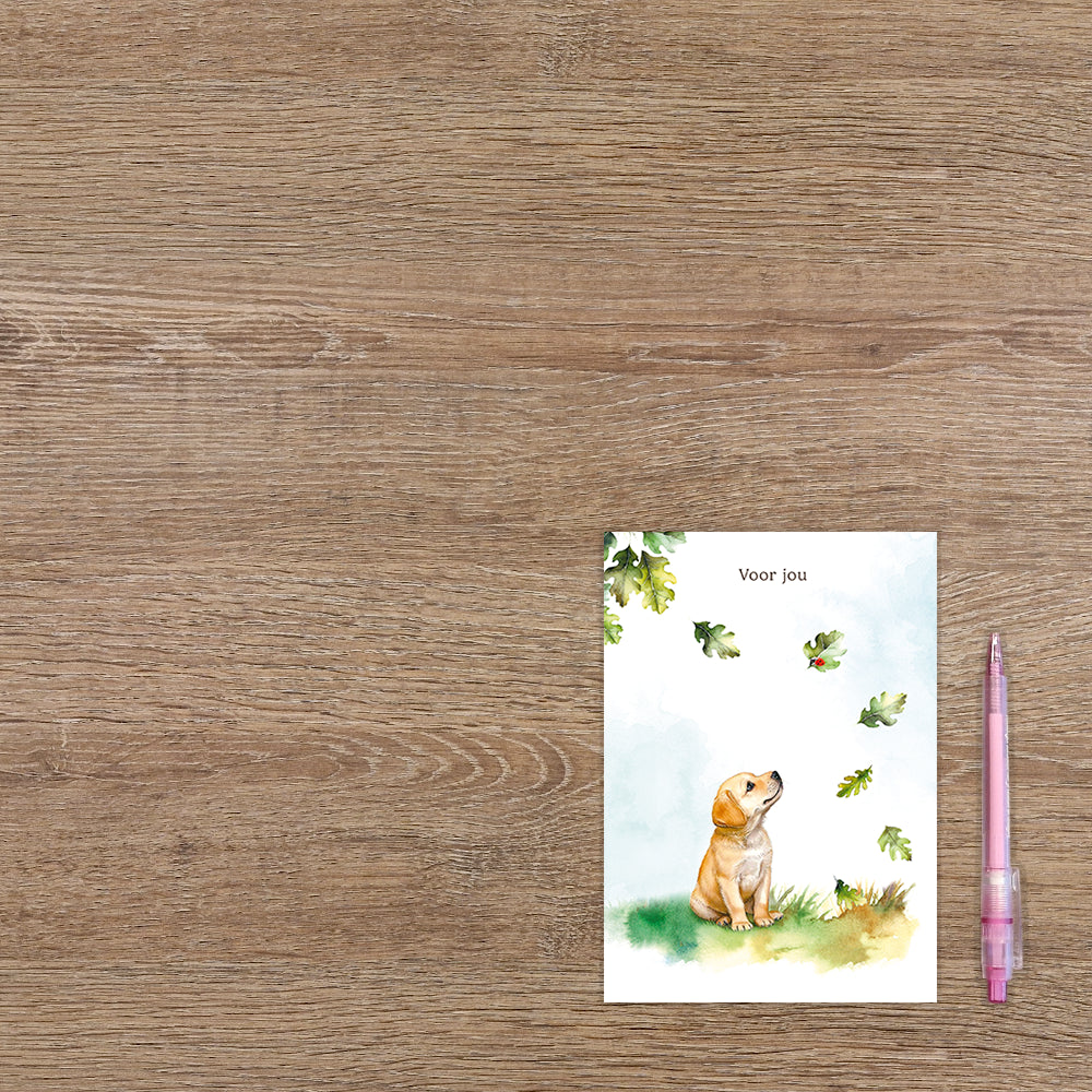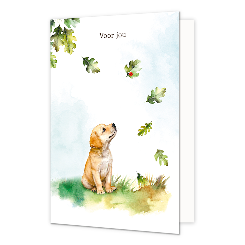 De wenskaart heeft een afmeting van x en een staande vorm. Op deze wenskaart staat een hondje die kijkt naar vallende blaadjes van een boom. Bovenaan staat de tekst: "Voor jou". De binnenzijde van de wenskaart is blanco wat voldoende ruimte geeft om een persoonlijke boodschap te schrijven .
