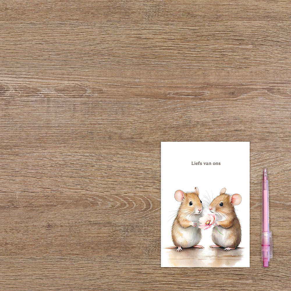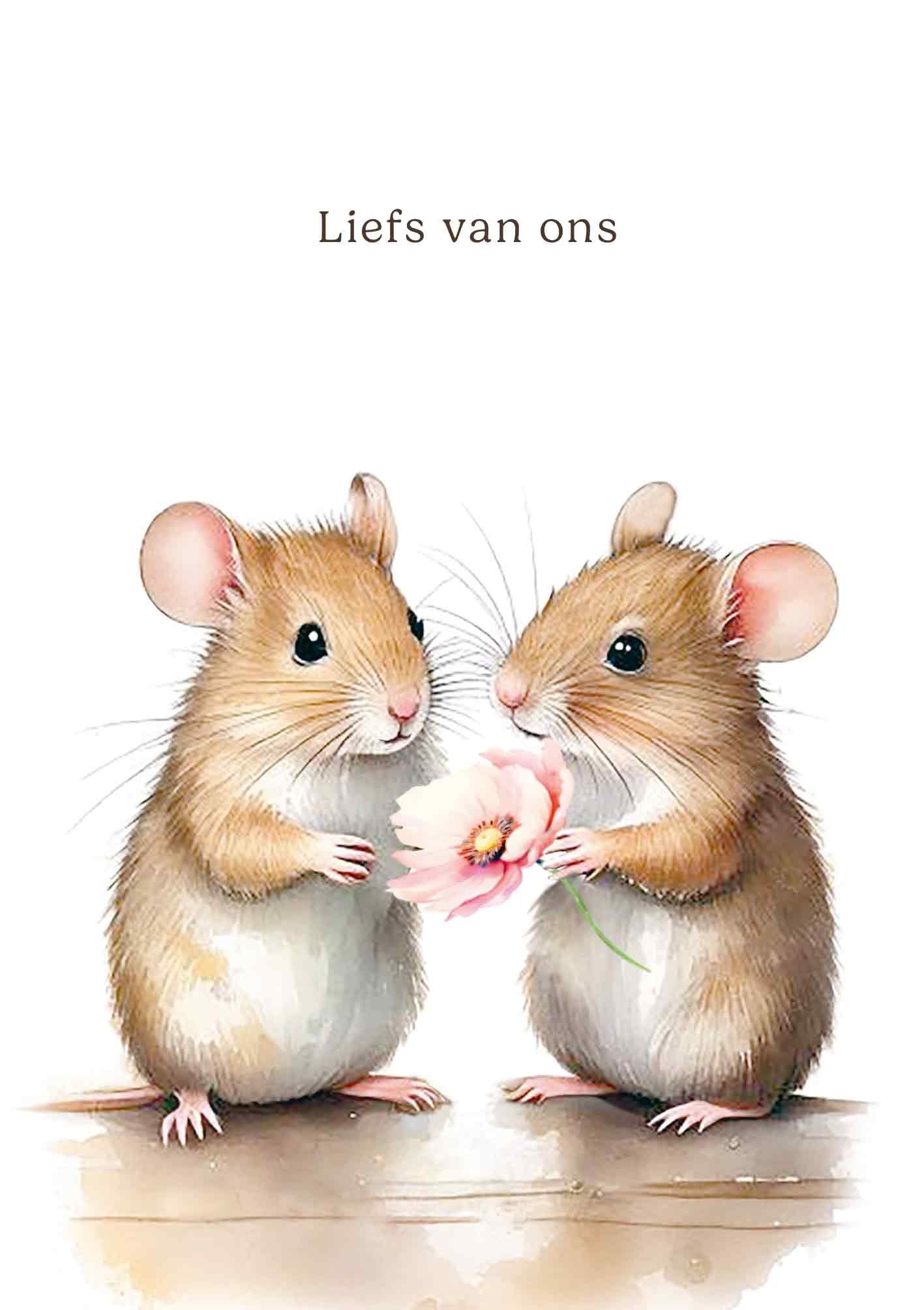 De wenskaart heeft een afmeting van x en een staande vorm. Op deze wenskaart staan twee muisjes waarvan er één een roze bloem vast heeft. Daarboven staat de tekst: "Liefs van ons". De binnenzijde van de wenskaart is blanco wat voldoende ruimte geeft om een persoonlijke boodschap te schrijven .