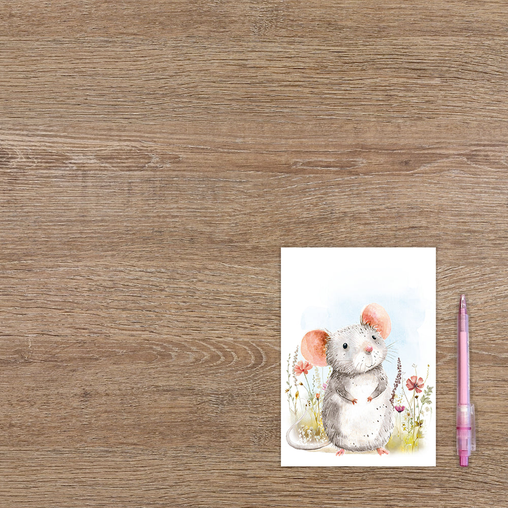 De wenskaart heeft een afmeting van x en een staande vorm. Op deze wenskaart staat een grijs muisje tussen bloemen. De binnenzijde van de wenskaart is blanco wat voldoende ruimte geeft om een persoonlijke boodschap te schrijven .