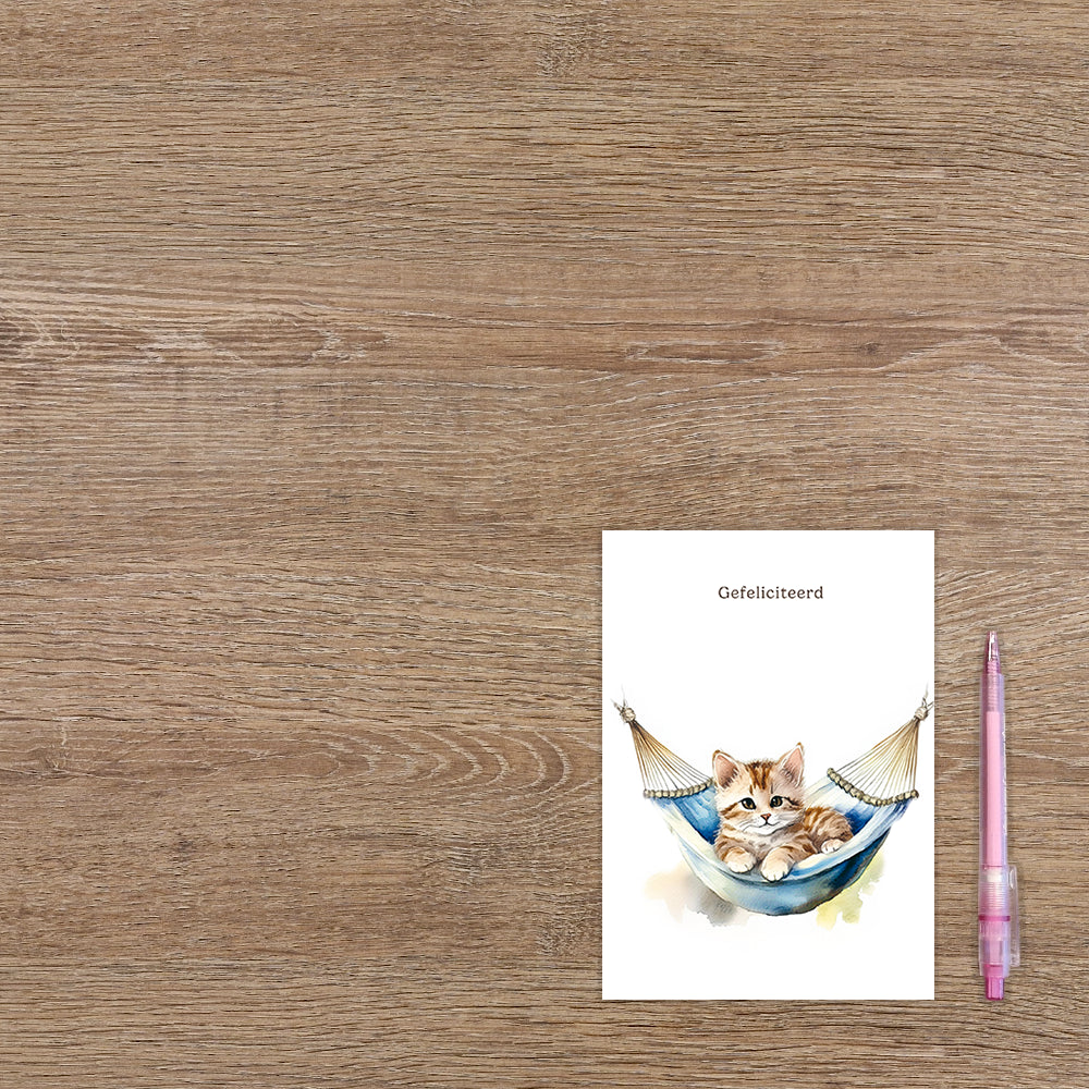 De wenskaart heeft een afmeting van x en een staande vorm. Op deze wenskaart staat een kat die in een hangmat ligt met daarboven de tekst: "Gefeliciteerd". De binnenzijde van de wenskaart is blanco wat voldoende ruimte geeft om een persoonlijke boodschap te schrijven .