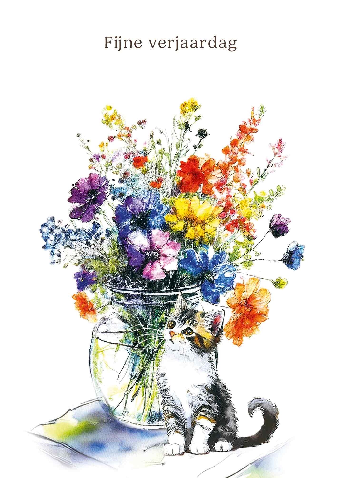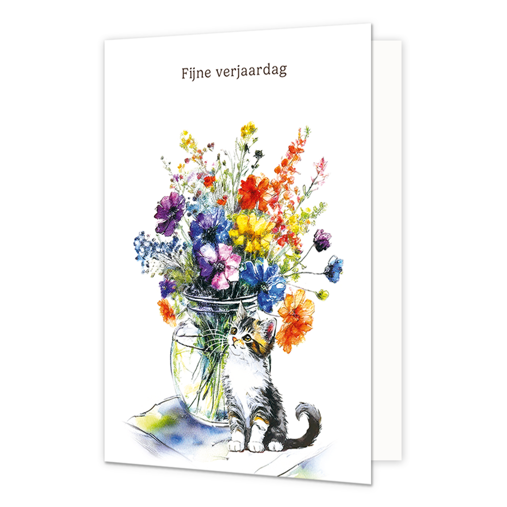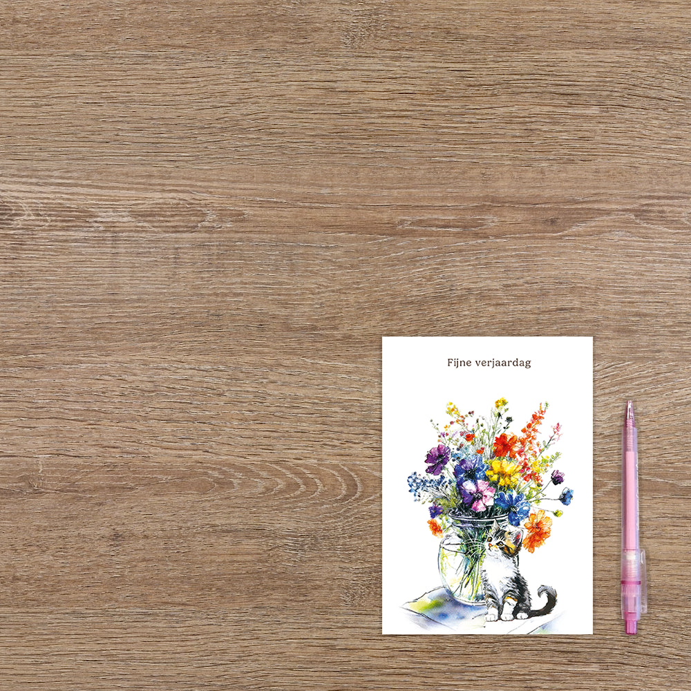 De wenskaart heeft een afmeting van x en een staande vorm. Op deze wenskaart staat een vaas met een bos bloemen en een kat ernaast. Daarboven staat de tekst: "Fijne verjaardag". De binnenzijde van de wenskaart is blanco wat voldoende ruimte geeft om een persoonlijke boodschap te schrijven .