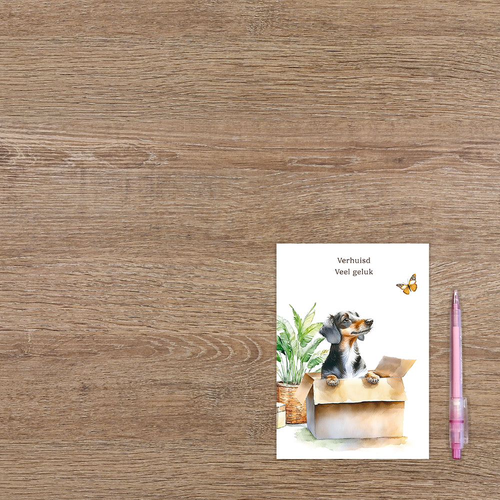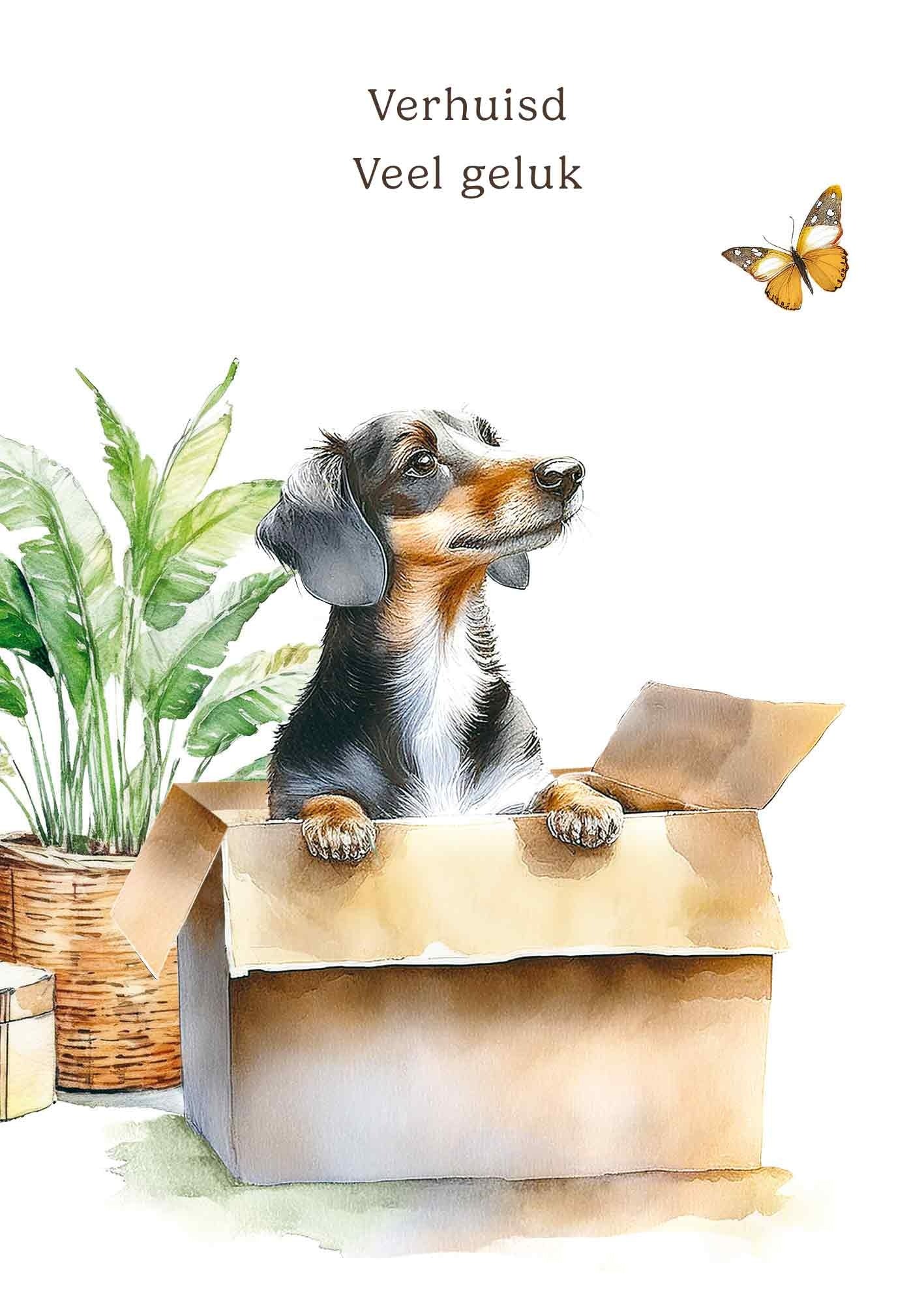 De wenskaart heeft een afmeting van x en een staande vorm. Op deze wenskaart staat een hond die uit een doos kijkt naar een vlinder met daarboven de tekst: "Verhuis veel geluk". De binnenzijde van de wenskaart is blanco wat voldoende ruimte geeft om een persoonlijke boodschap te schrijven .