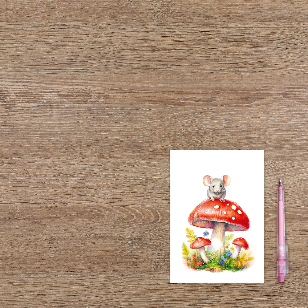 De wenskaart heeft een afmeting van x en een staande vorm. Op deze wenskaart staan paddenstoelen waar een muisje bovenop zit. De binnenzijde van de wenskaart is blanco wat voldoende ruimte geeft om een persoonlijke boodschap te schrijven .