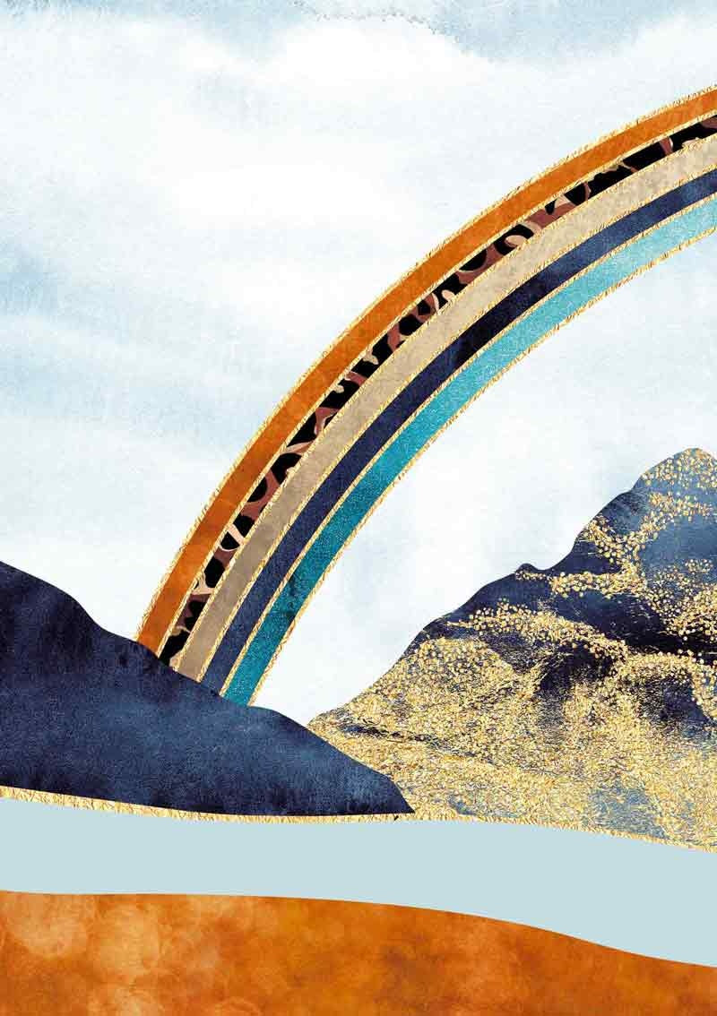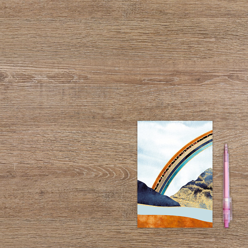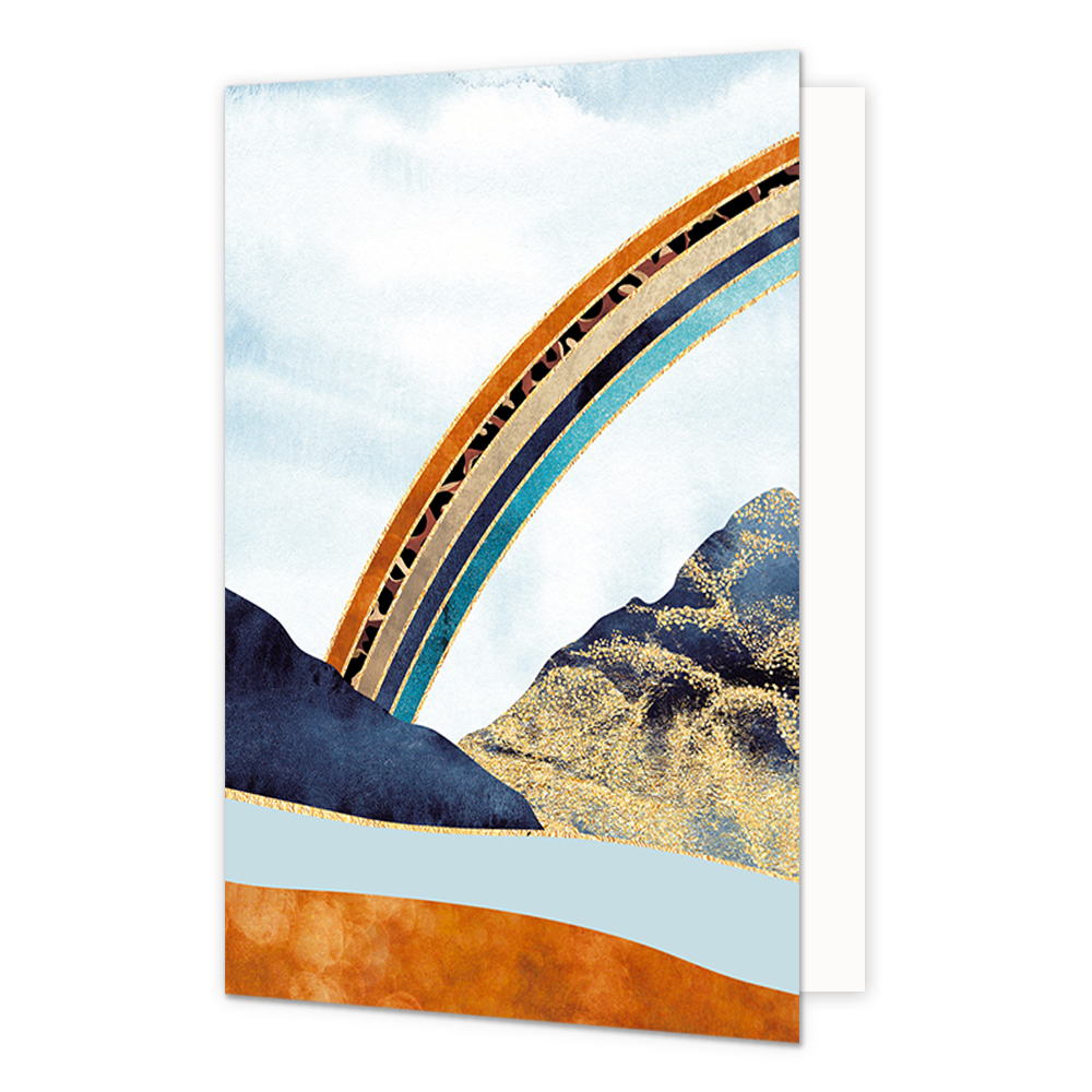 De wenskaart heeft een afmeting van x en een staande vorm. Op deze artistieke wenskaart staat een regenboog die boven bergen en water staat. De binnenzijde van de wenskaart is blanco wat voldoende ruimte geeft om een persoonlijke boodschap te schrijven .