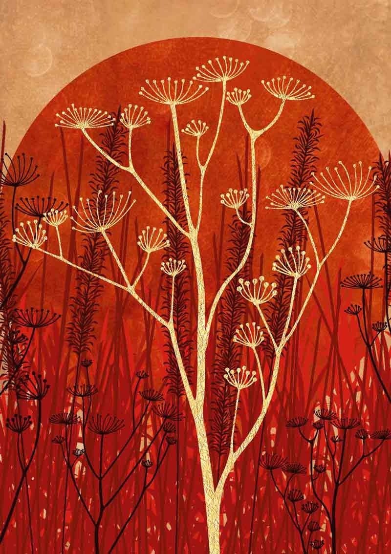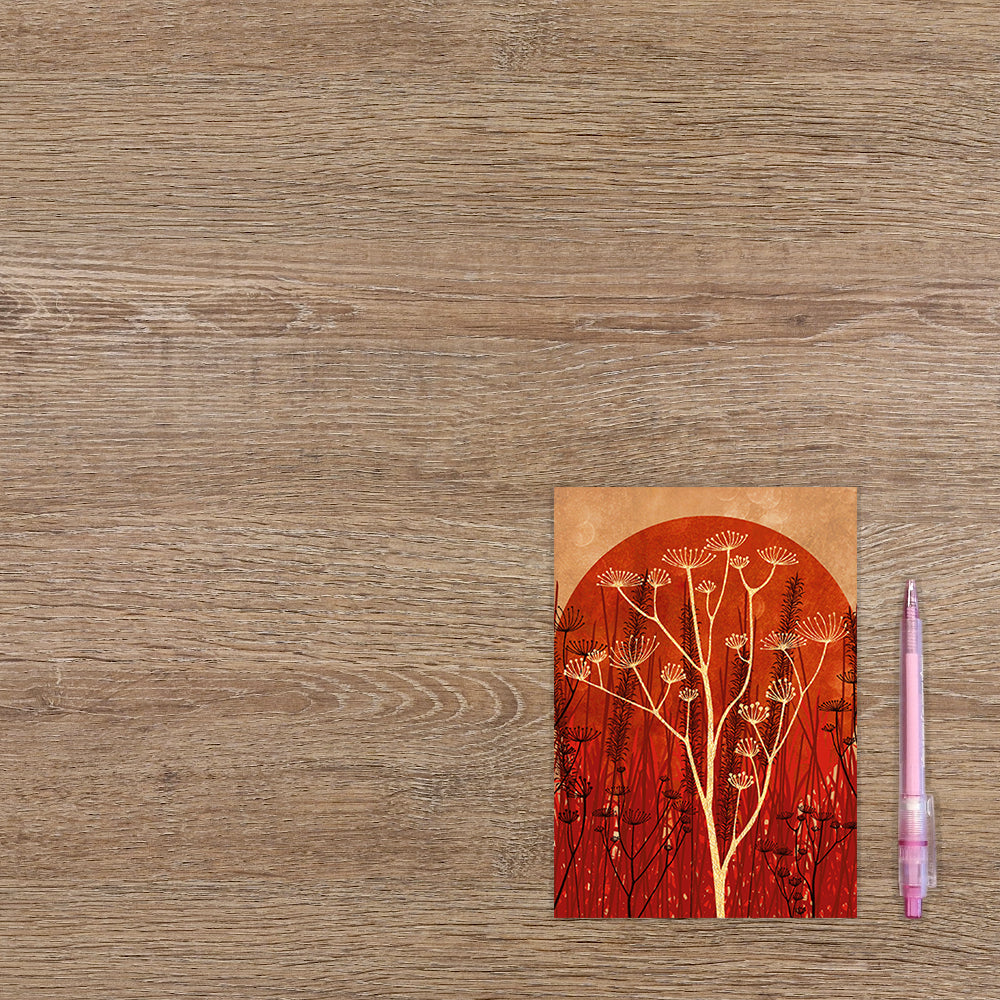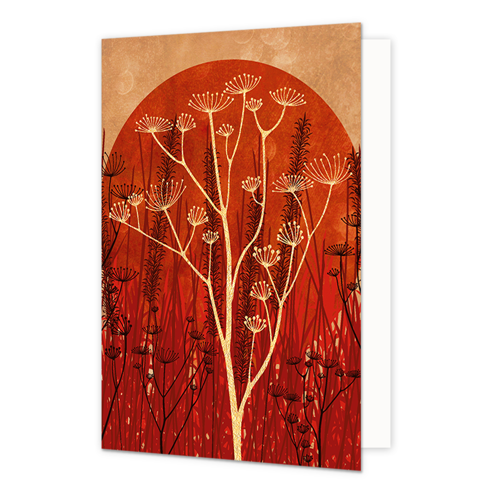 De wenskaart heeft een afmeting van x en een staande vorm. Op deze artistieke wenskaart staat een gouden boom op een rode achtergrond. De binnenzijde van de wenskaart is blanco wat voldoende ruimte geeft om een persoonlijke boodschap te schrijven .