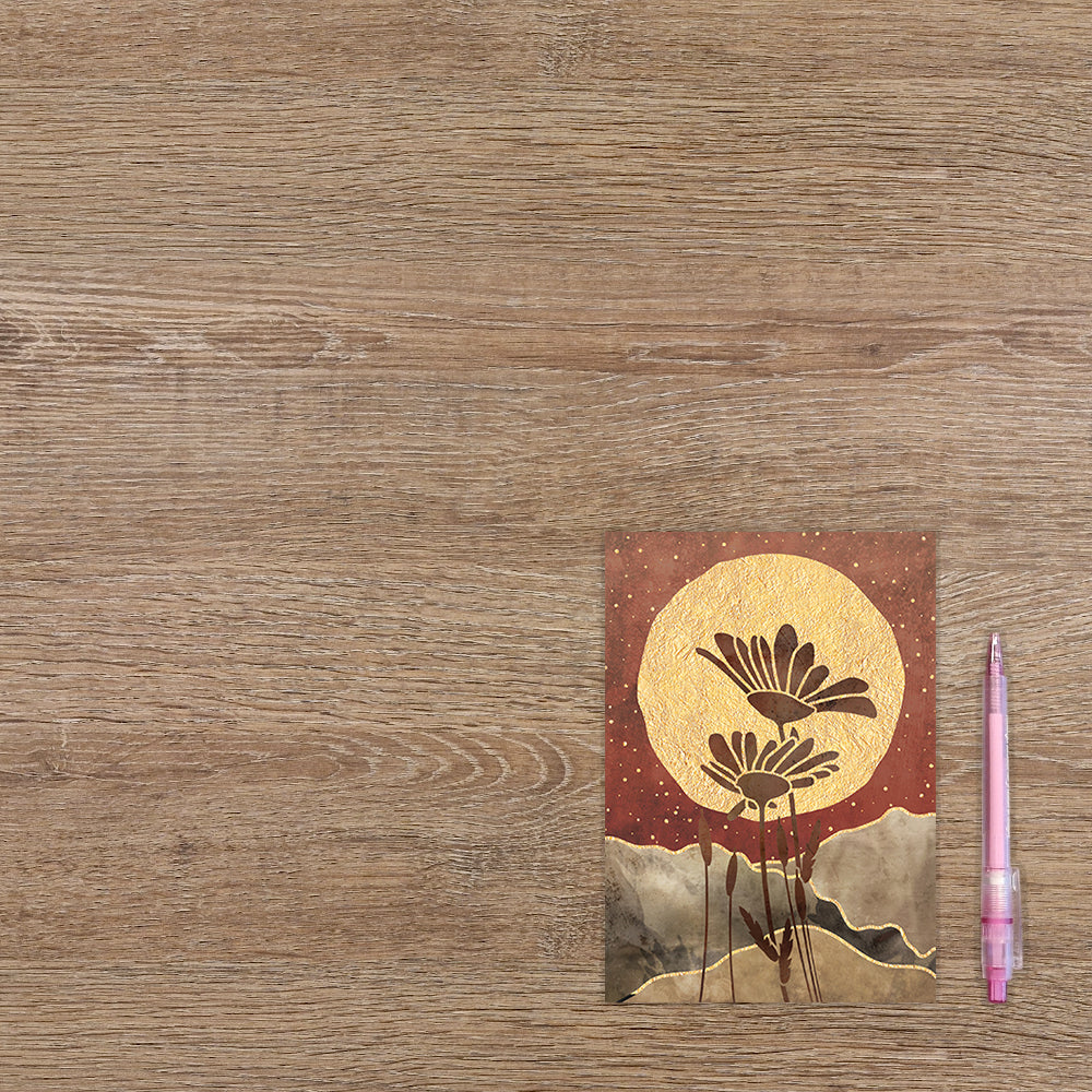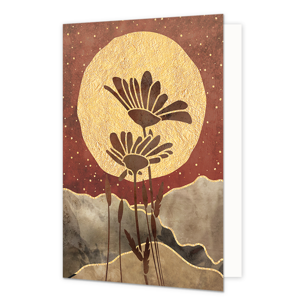 De wenskaart heeft een afmeting van x en een staande vorm. Op deze artistieke wenskaart staan twee bruine nacht bloemen met op de achtergrond een gouden maan met bergen. De binnenzijde van de wenskaart is blanco wat voldoende ruimte geeft om een persoonlijke boodschap te schrijven .